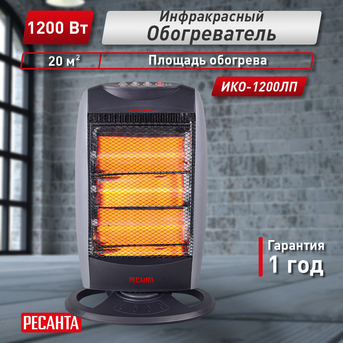 Инфракрасные обогреватели Инфракрасный обогреватель Ресанта ИКО-1200ЛП, кварцевый, до 12м2, мощность 1.2 кВт, поворотный