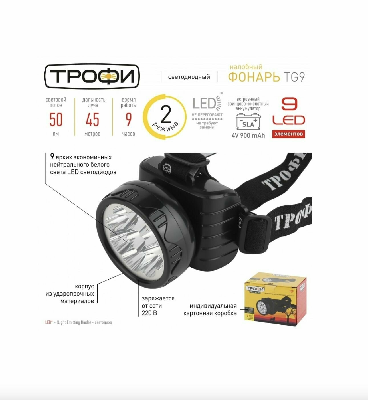 TG9 Фонарь Трофи Акку налобный 4V0.9Ah, 9xLED, ЗУ 220V, карт (25/50/600)