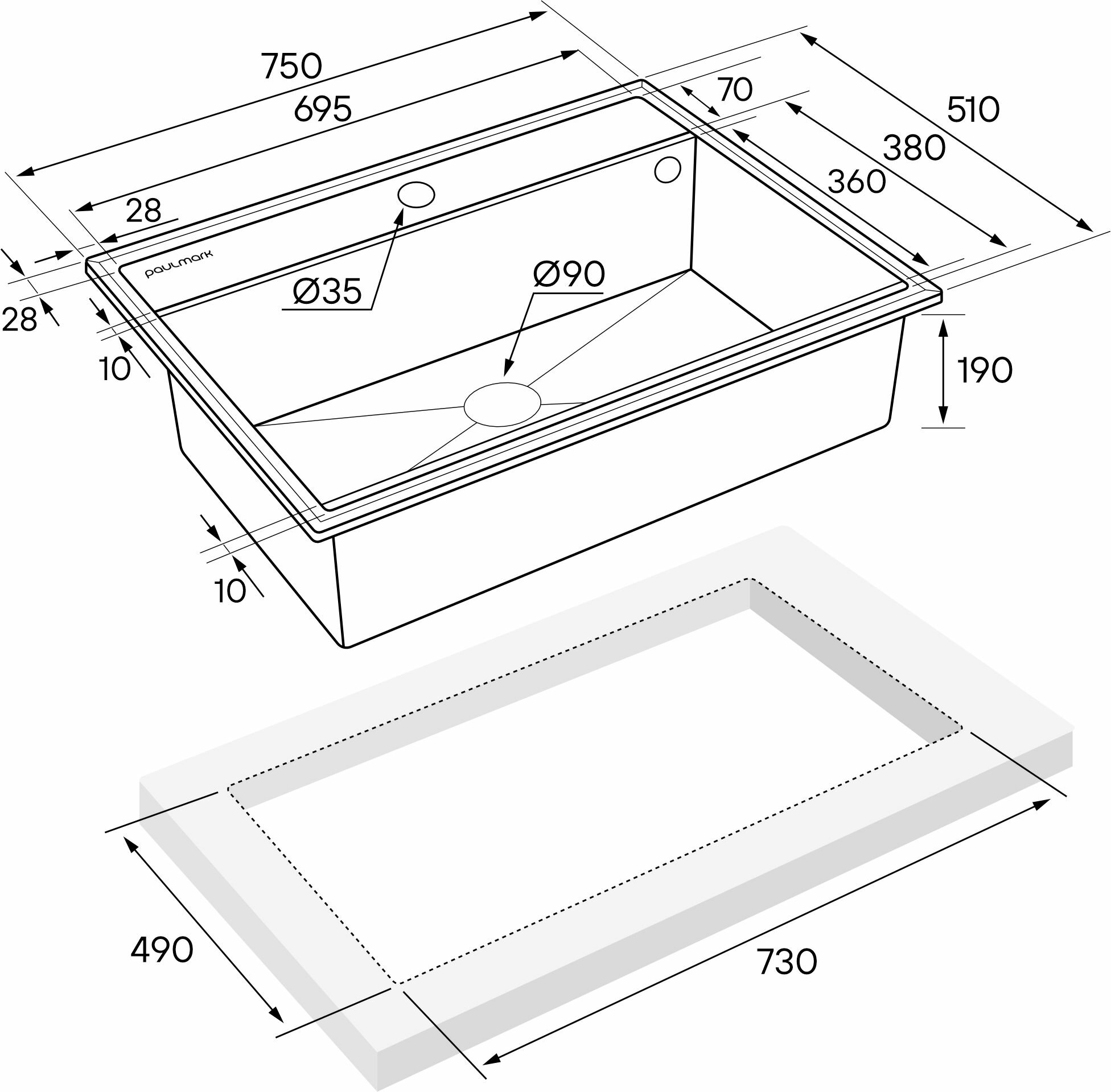 Мойка для кухни из нержавеющей стали AISI304 Paulmark VELTEN 75, 750х510 мм, PVD и шумопоглащающее покрытие, отверстие под смеситель, универсальный монтаж, цвет вороненая сталь 39 500 ₽ Подробнее