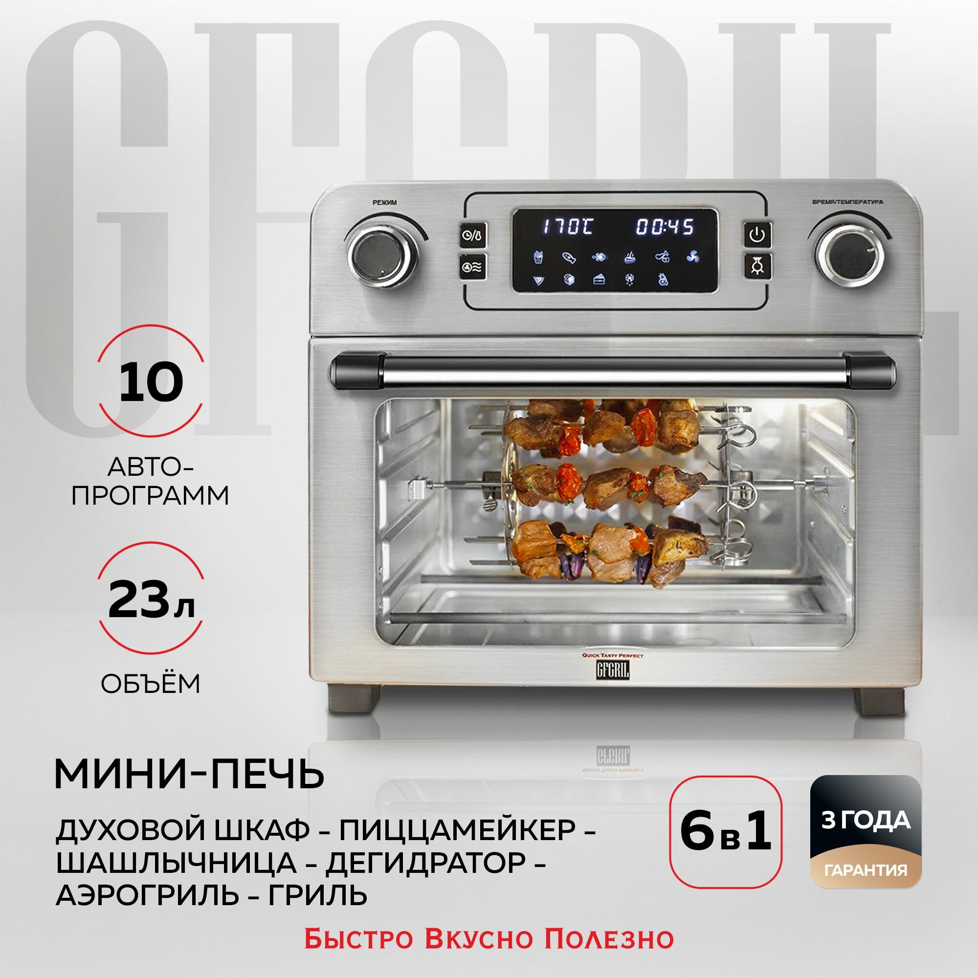 Многофункциональная мини-печь GFGRIL GFAO-700 с функцией аэрогриля, шашлычницей, вертелом для гриля и камнем для пиццы