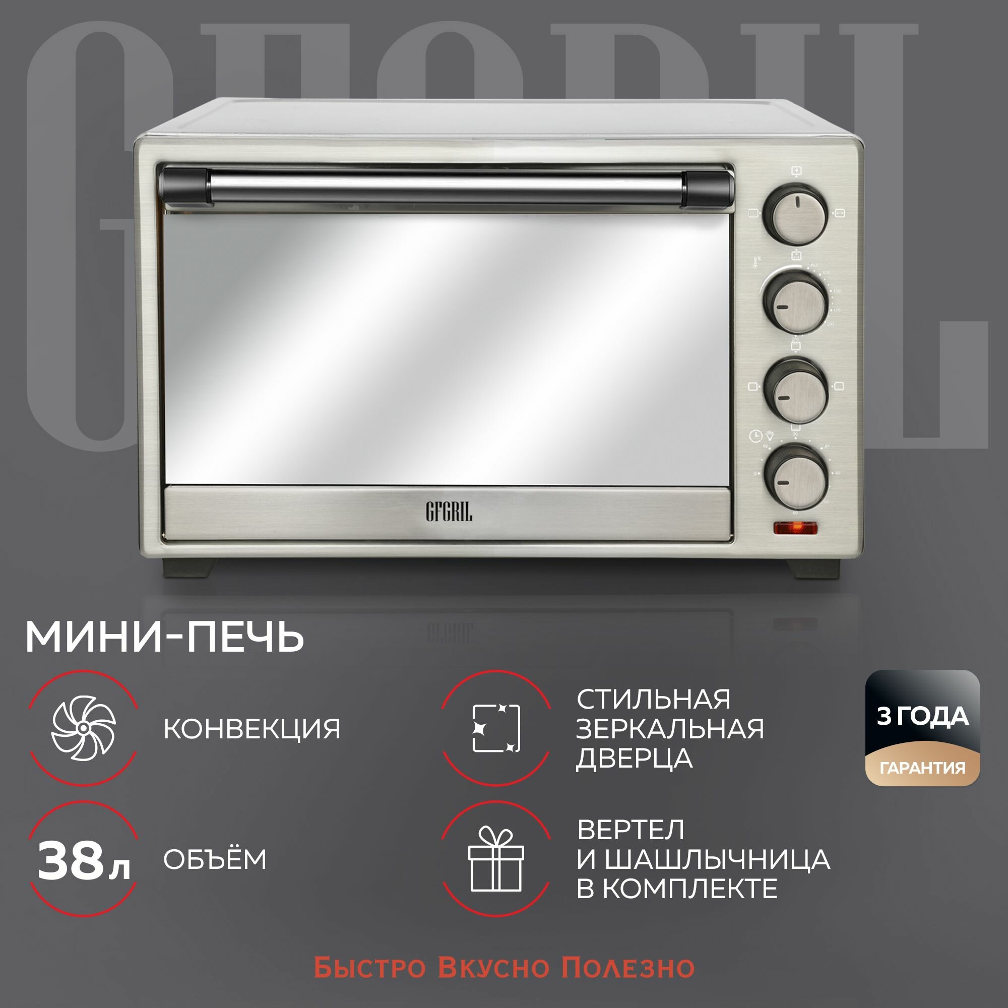 Многофункциональная электрическая мини-печь GFGRIL GFO-39 MIRROR, 38л, электрическая духовка из нержавейки, вертел, шашлычница, коврик для выпечки / духовой шкаф с конвекцией