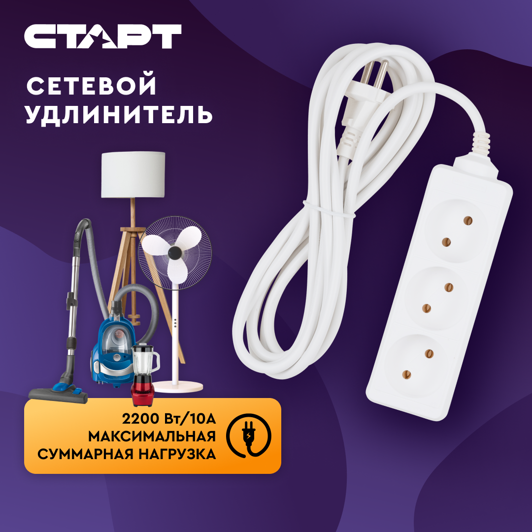Удлинитель сетевой бытовой 3м старт 3 розетки, 10А, ПВС 2х0.75, 2200 Вт 434 ₽ Подробнее