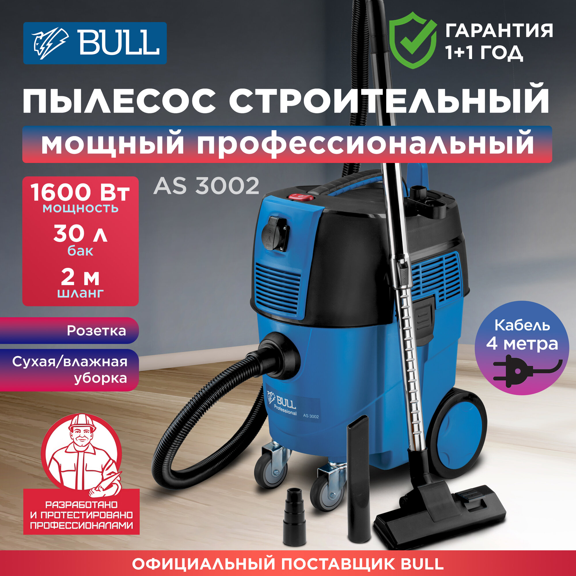Пылесос Пылесос BULL AS 3002 + аксессуары 1600 Вт, 30 л, 6м кабель, 3м шланг, HEPA, автомат.