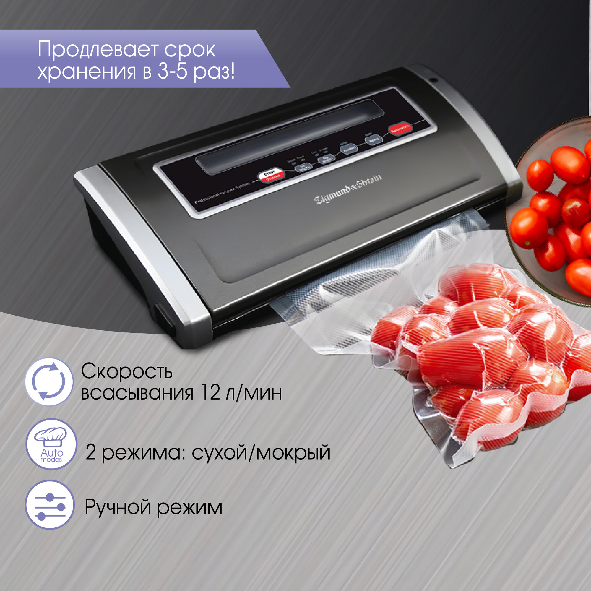 Лучшие цены. VS-505 — это вакуумный упаковщик от Zigmund & Shtain, который поможет надолго сохранить продукты свежими. Он подходит для работы с рулонной пленкой, пакетами и контейнерами. Эффективно удаляет воздух из упаковки с сухими и влажными продуктами. Вакуумный упаковщик Zigmund & Shtain VS-505 имеет следующие функции: · автоматическое вакуумирование; · выбор вида продукта (сухой или влажный, твердый или мягкий). Магазины в вашем городе.