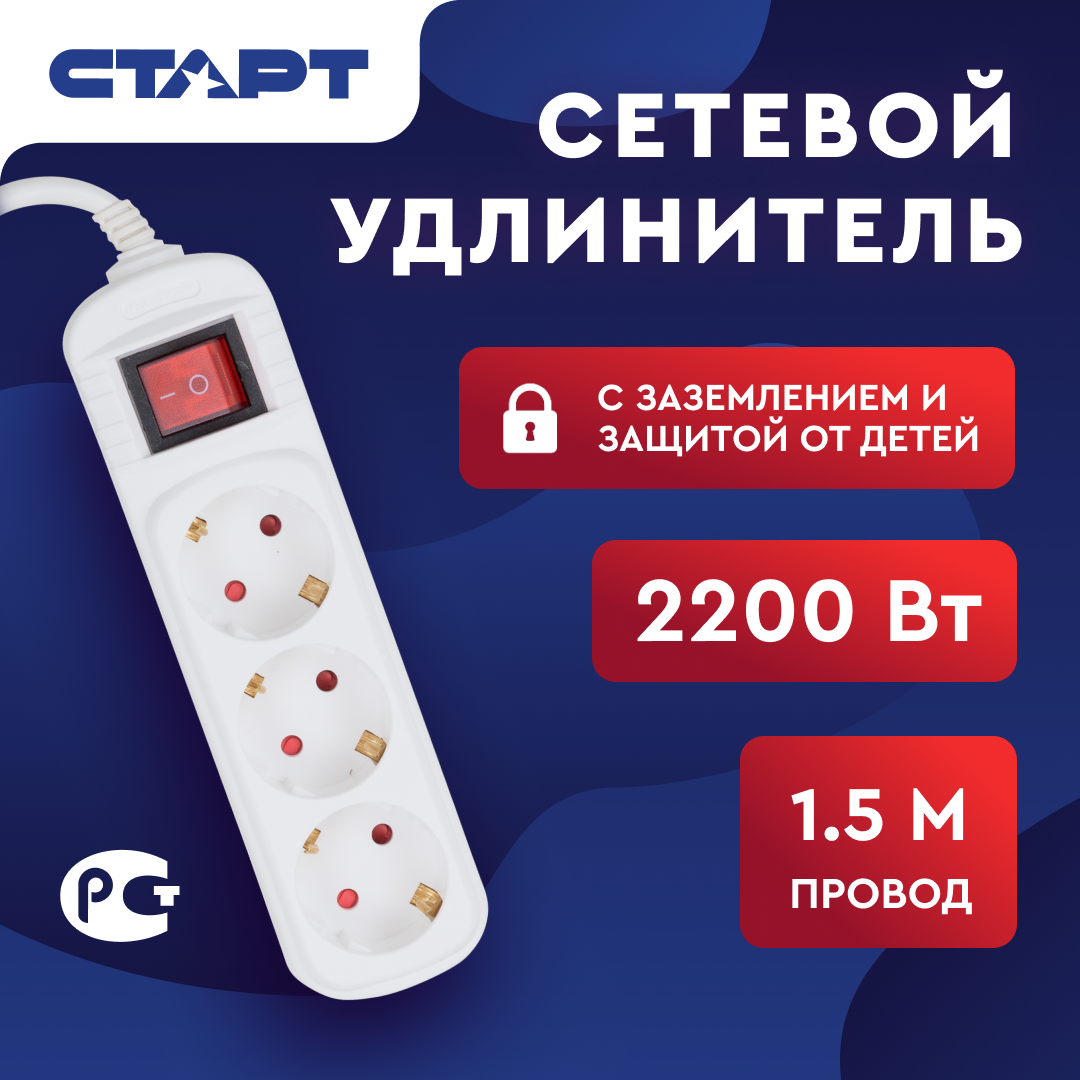 Сетевой фильтр / удлинитель Удлинитель сетевой бытовой c заземлением 1,5м старт 3 розетки, 10А, 2200Вт защита от детей