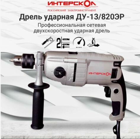 Дрели и шуруповерты Дрель ударная электрическая ИНТЕРСКОЛ ДУ-13/820ЭР (810Вт, ключ патрон-13мм, 2скорости, метал редуктор, 2,8кг, коробка)