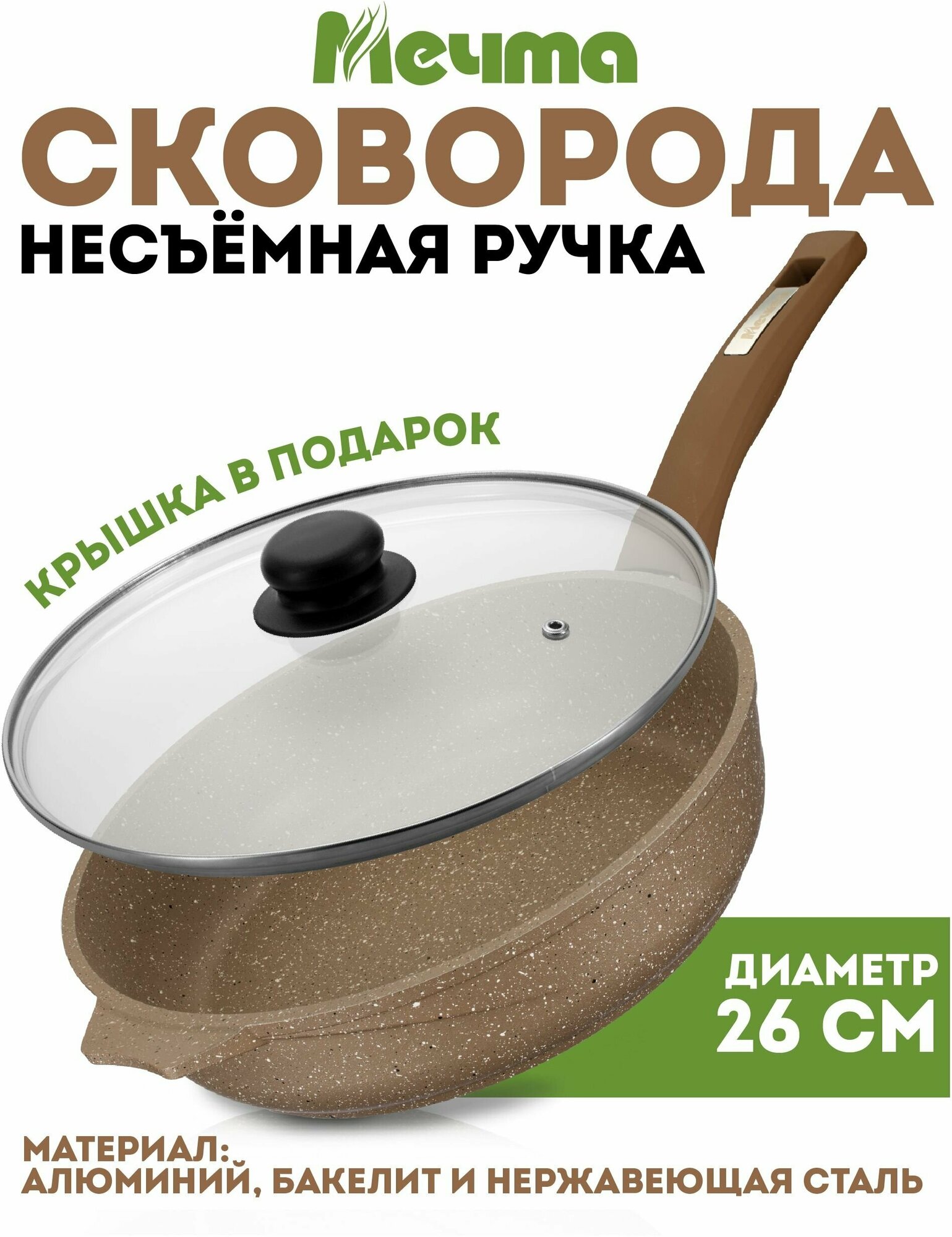 Сковородки Сковорода с гранитным антипригарным покрытием крышкой и съемной ручкой 26 см Мечта