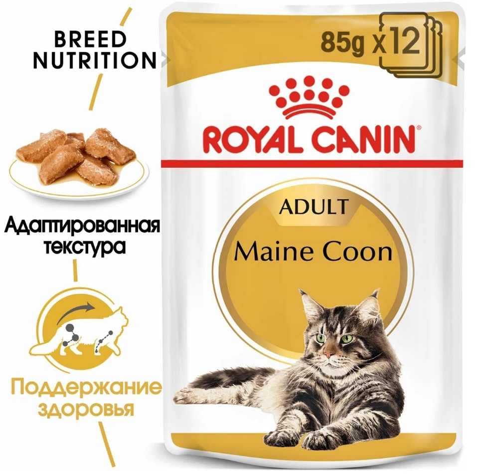 Влажный корм для кошек Royal Canin Maine Coon Adult, для взрослых кошек породы мейн-кун, 12 шт. х 85 г (кусочки в соусе)