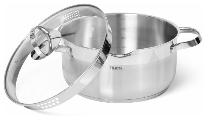 5208 FISSMAN Кастрюля CALLISTO 24x11,5см / 5л со стеклянной крышкой (нерж.сталь) Со сливом; Ручки - нерж.сталь; Крышка - стекло с отверстием для паровыпуска и встроенным сливом; Индукция; Термоаккумулирующее многослойное дно.
