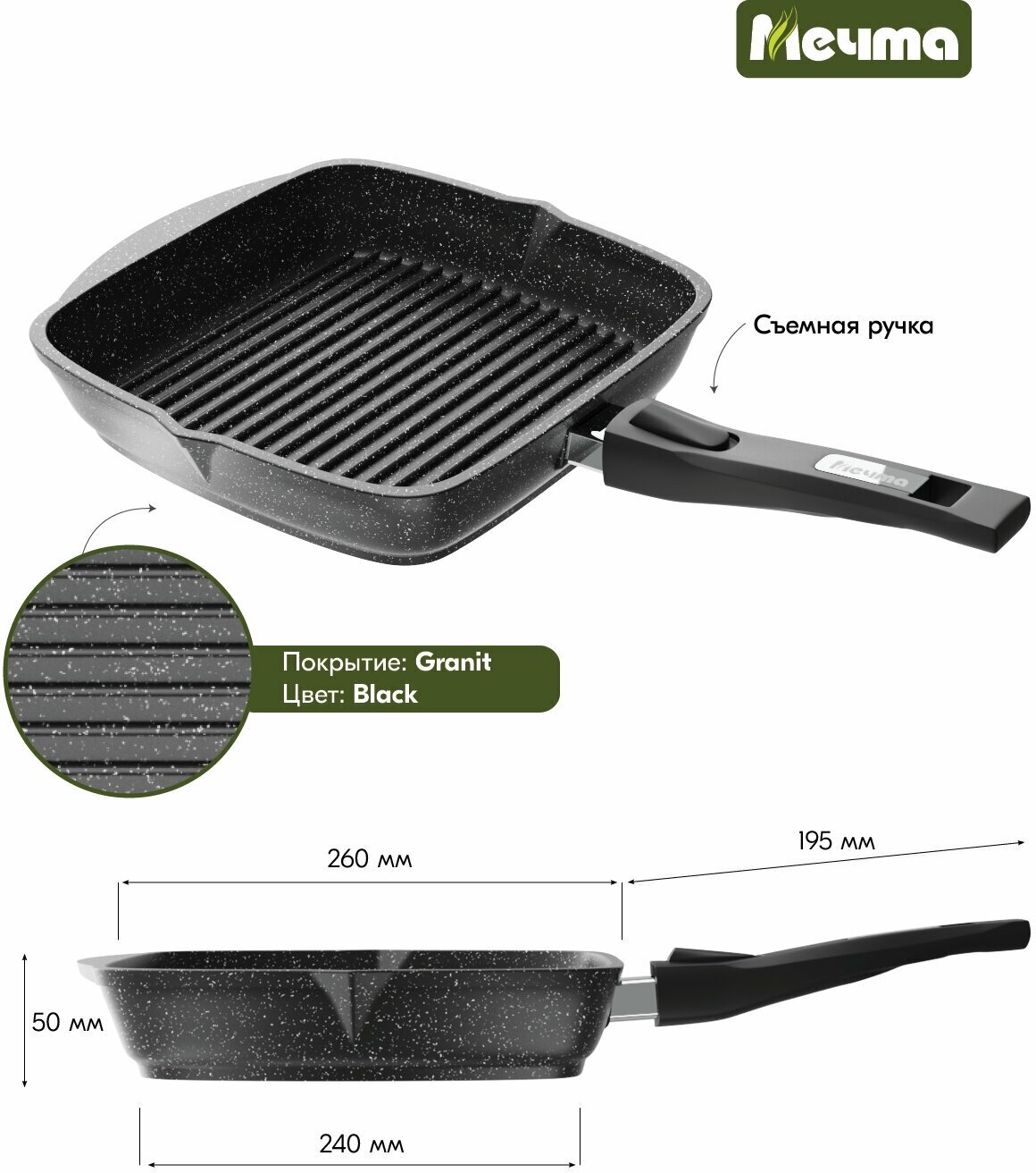 Сковорода-гриль мечта посуда мечта Гранит black, квадратная, съемная ручка, 26 см