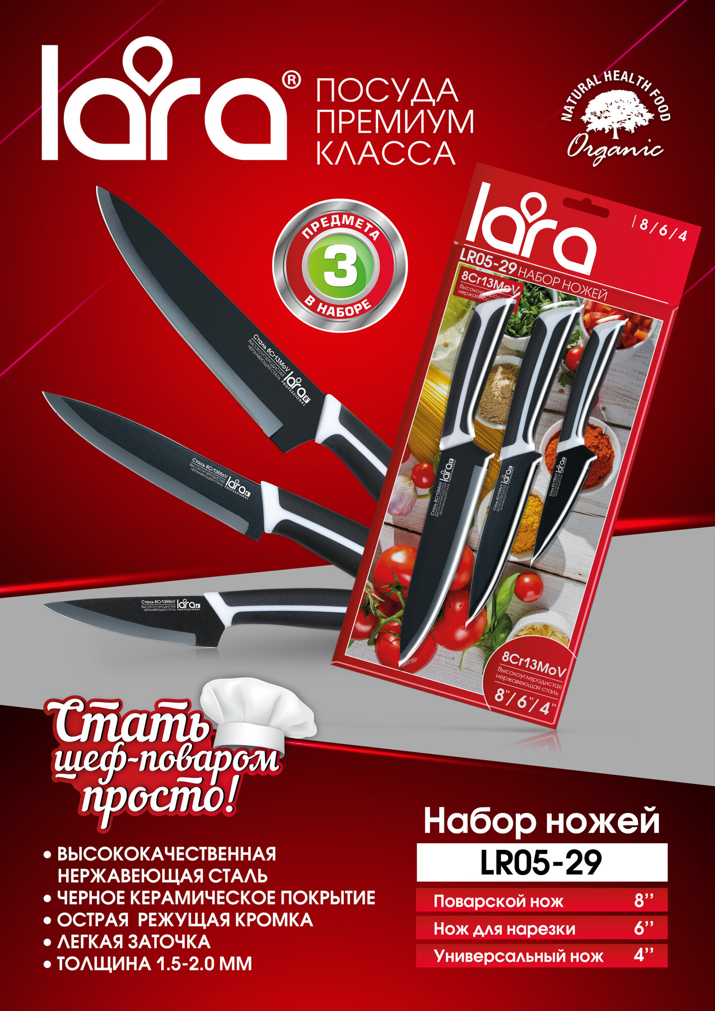 LR05-29 LARA Набор ножей: 3 предмета, черное керамическое покрытие Black Ceramic (полный блистер) 797 ₽ Подробнее