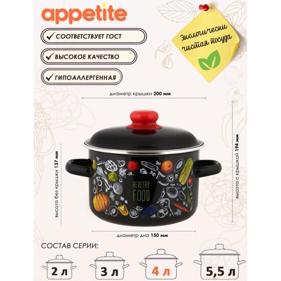 Кастрюля эмалированная Appetite Healthy food, с крышкой, 3 л 1 796 ₽ Подробнее