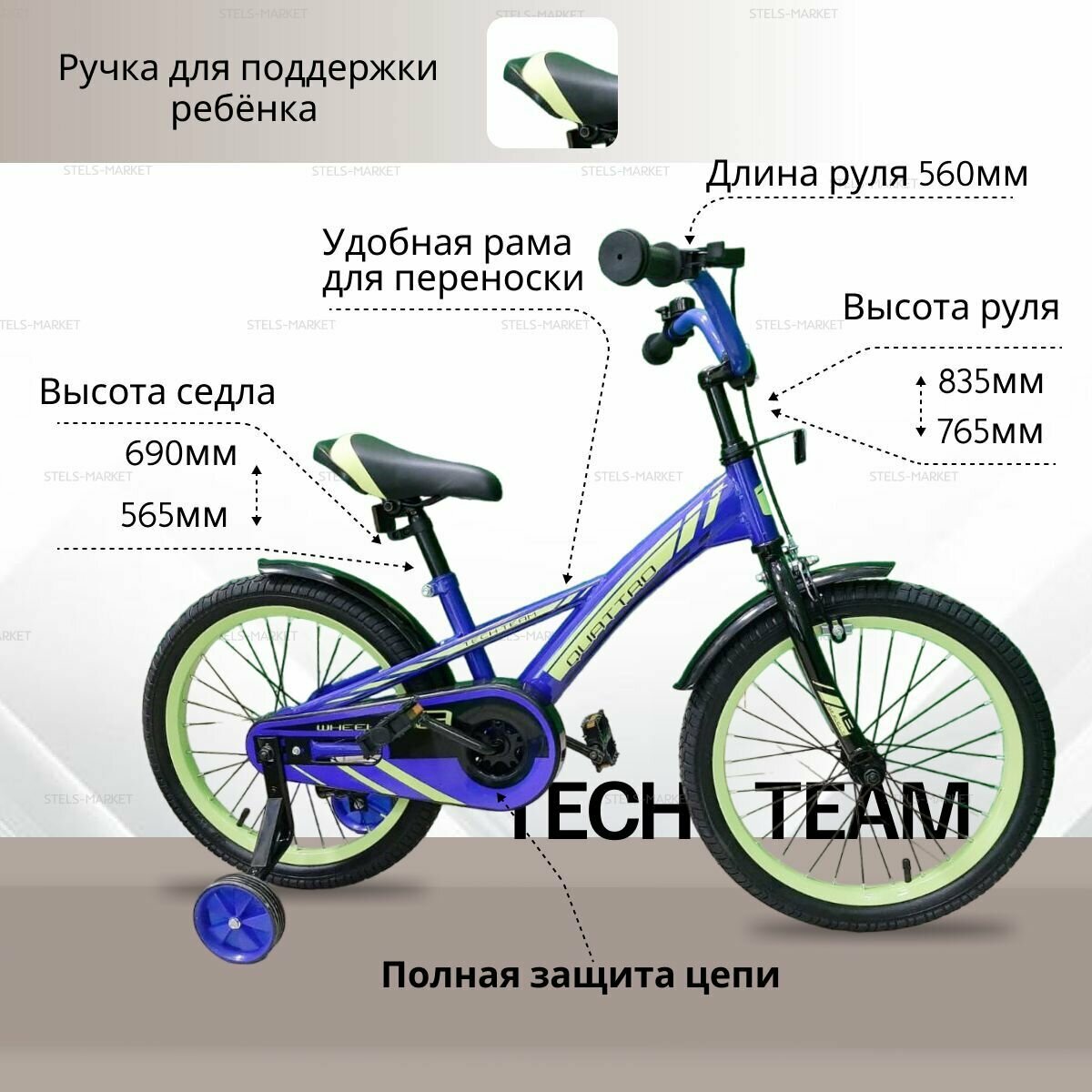 Детский велосипед 14 Tech Team "Quattro" неоновый зеленый