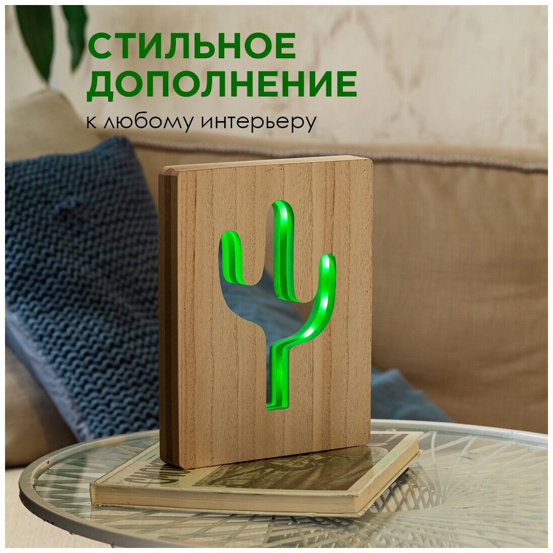 Светодиодный ночник Кактус, цвет свечения зеленый, 2хАА, материал МДФ, 180х25х230мм, 12-186-111
