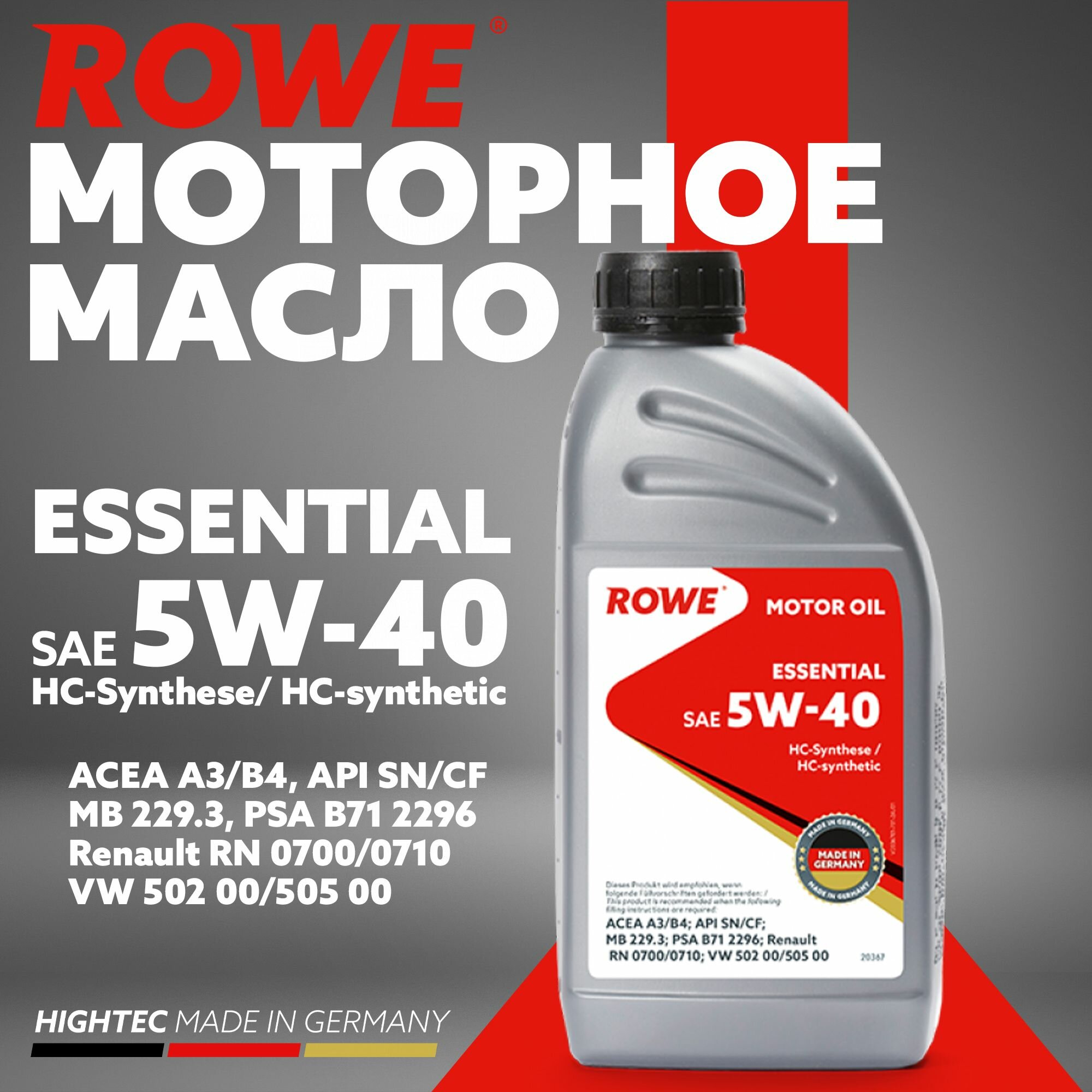 ROWE 20367-595-2A ROWE ESSENTIAL SAE 5W-40 (5 л.) ACEA A3/B4 API SN/CF RN0700/0710 VW502 00/505 00 MB229.3
