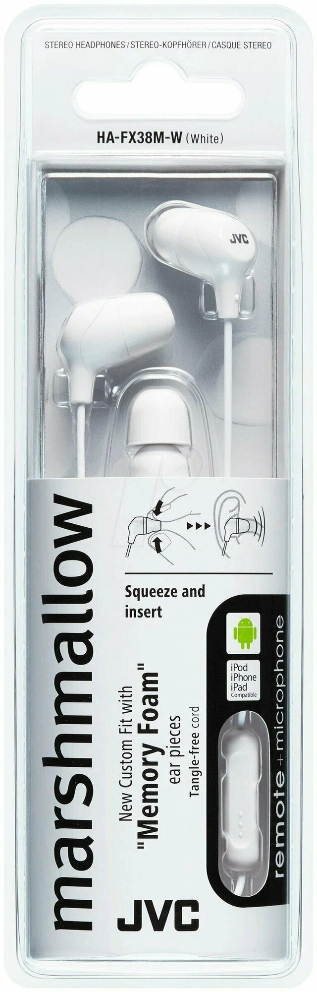 Наушники JVC HA-FX38M-W-E Marshmallow внутриканальные, проводные, встроенный микрофон, ПДУ, белые