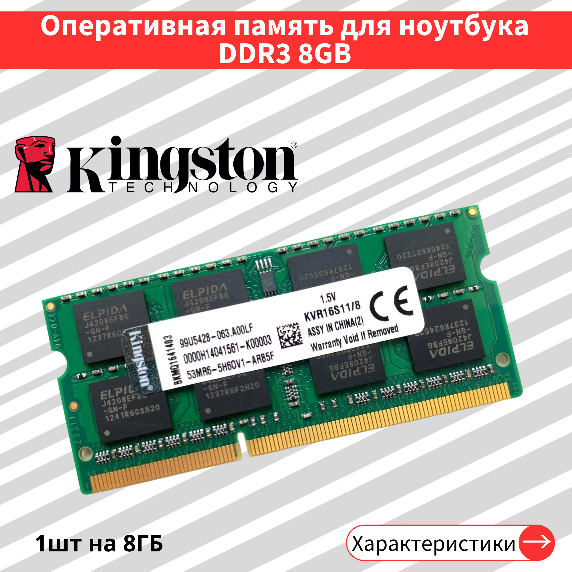 Оперативная память для ноутбука SODIMM DDR3 8Gb Kingston KVR16S11/8 1600MHz (PC-12800), 1.5V, 204-Pin, CL11, Retail