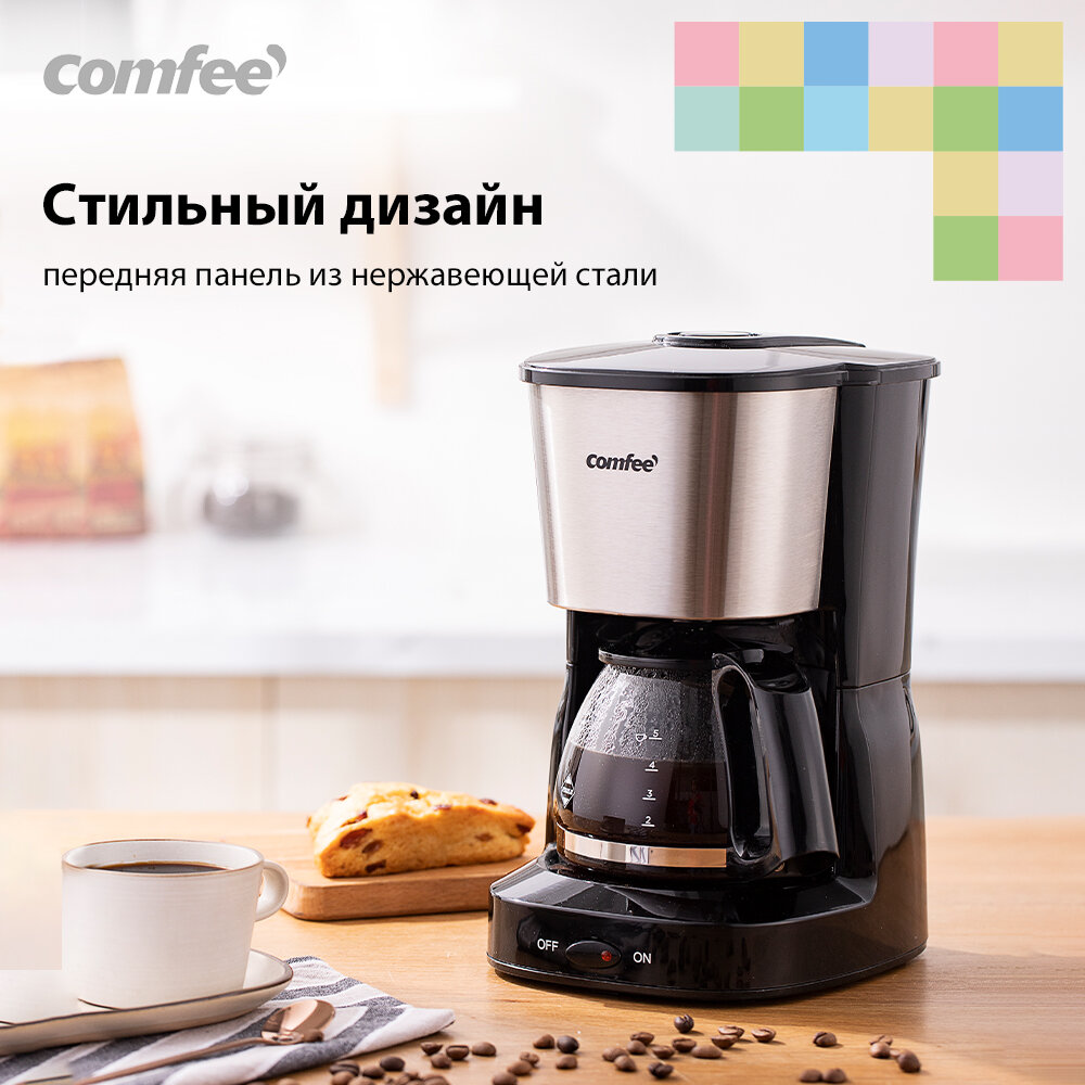 Кофеварки и кофемашины Кофеварка капельная Comfee CF-СМ2501, 600 Вт, стеклянный кувшин 650 мл, автоподогрев, противокапельная система, нержавеющая сталь/черный пластик