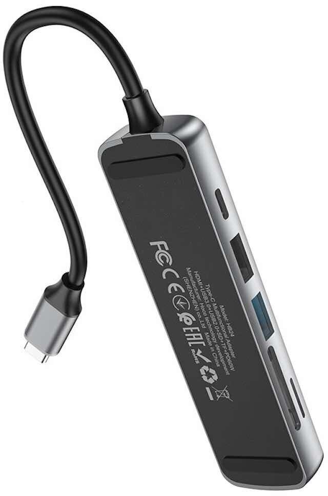 Многофункциональный Type-C хаб Hoco HB24 Easy display HDMI + USB3.0 + USB2.0 + SD + TF + PD, черный с серым