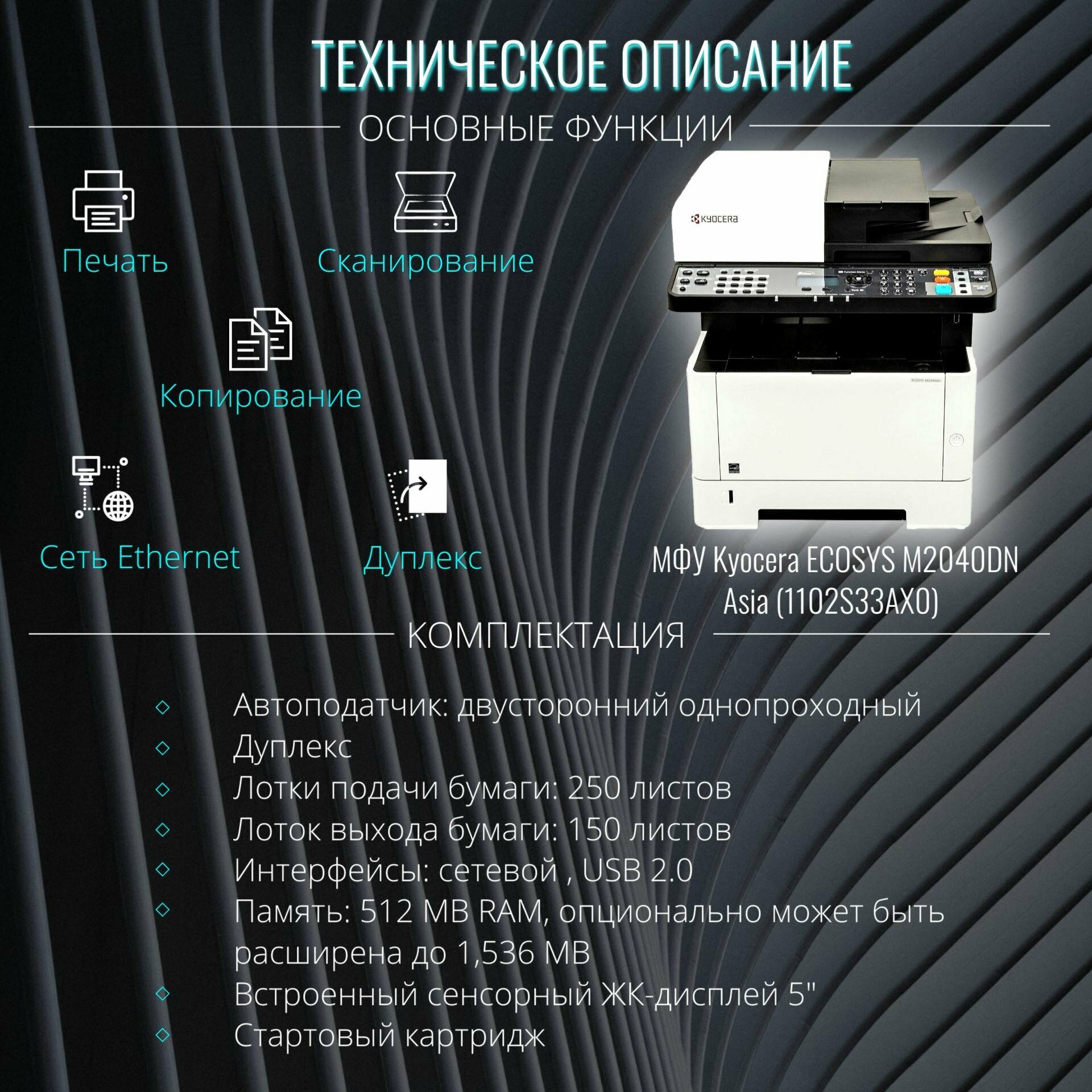 МФУ лазерное KYOCERA M2040dn (принтер, сканер, копир), А4, 40 стр./ мин., 50000 стр./ мес., дуплекс, АПД, с/ к (без кабеля USB)