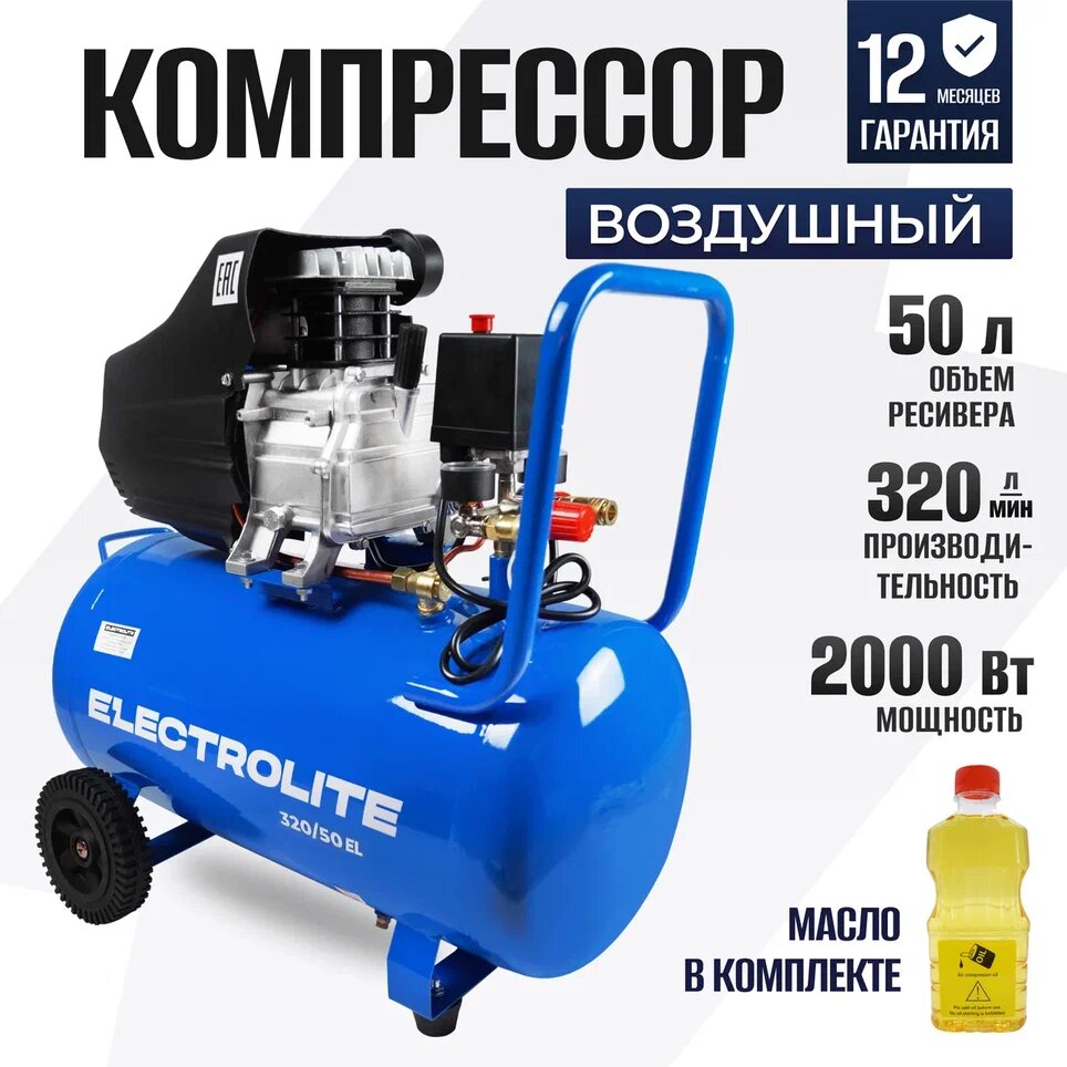 Компрессор воздушный / Компрессор / Компрессор воздушный 50л / Воздушный компрессор масляный ELECTROLITE 320/50 EL (ресивер 50 литров, 320 л/мин, 2000 Вт, 8 Атм, электрический, 2850 об./мин, 220В, передвижной, цилиндровый) 22 750 ₽ Подробнее