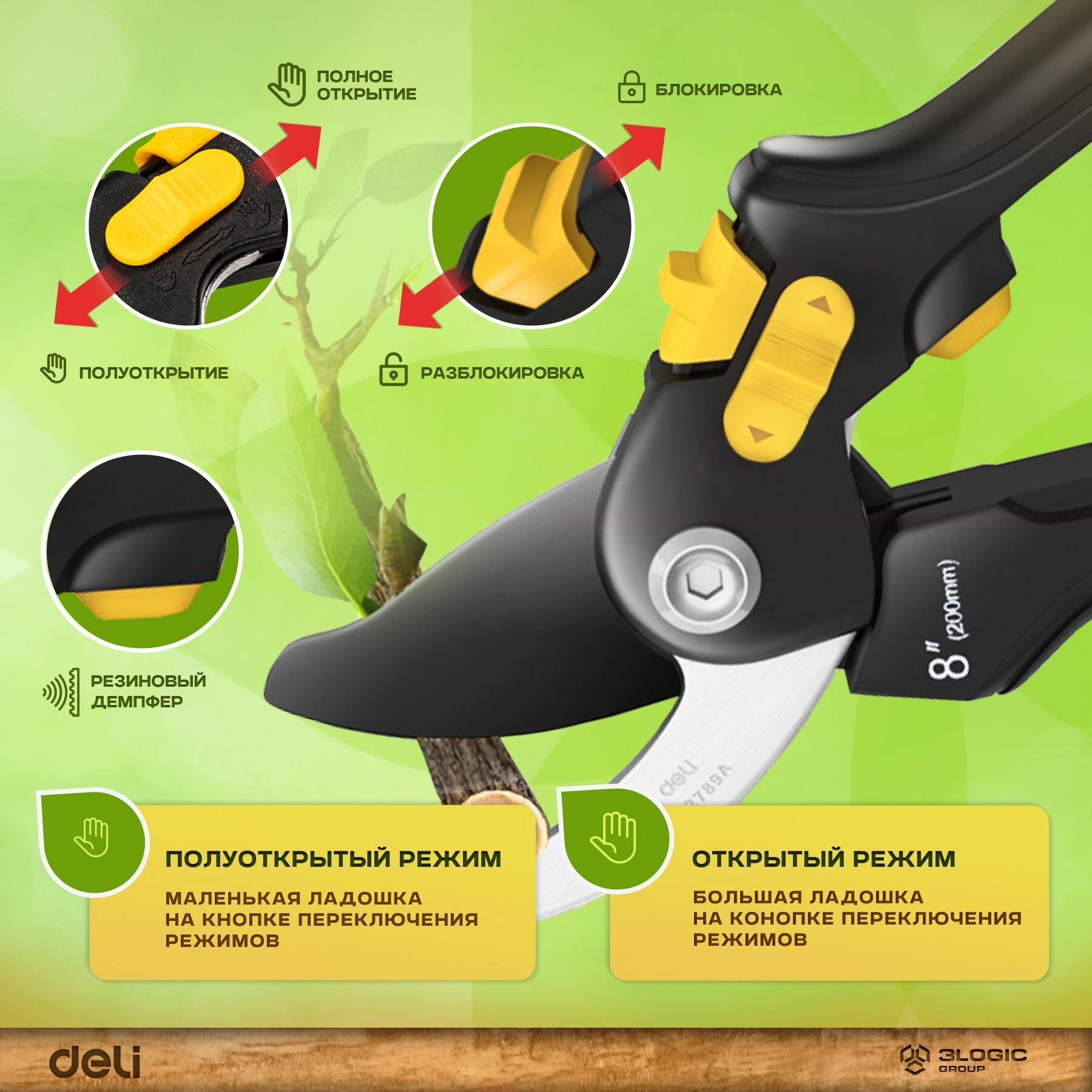 Секаторы и садовые ножницы Секатор садовый универсальный Deli DL2789A 200мм для дачи, сада, огорода, растений, орхидей, цветов, веток (лезвия с тефлоновым покрытием, два режима резки)