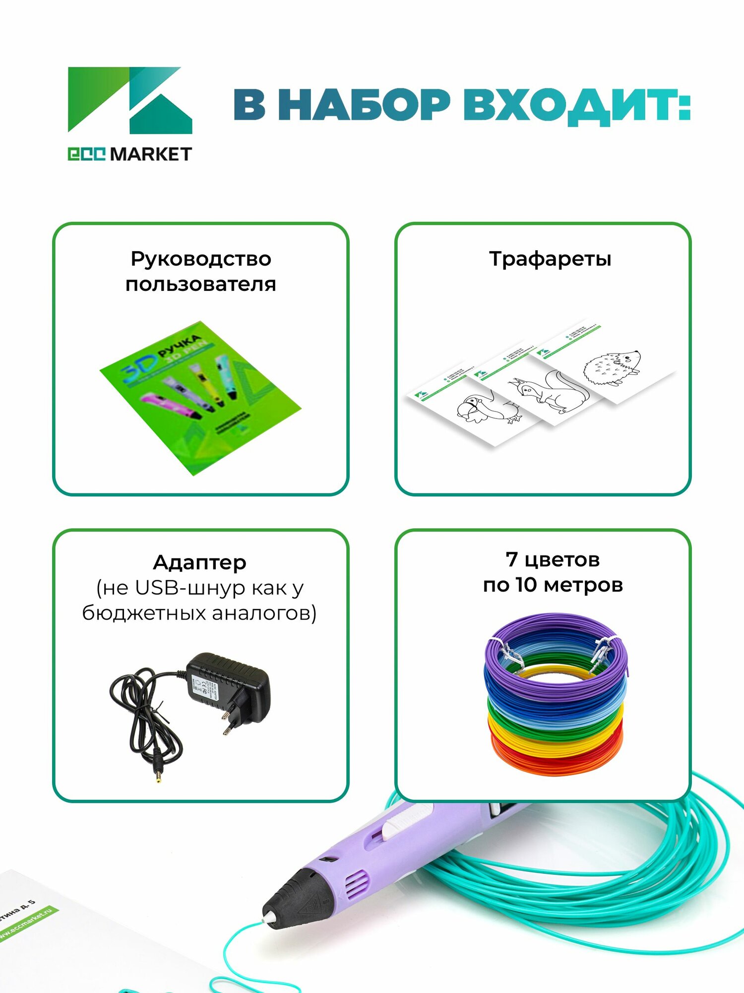 3D ручка ECC Market 3D Pen 2 с набором дополнительного пластика "радуга" и трафаретами фиолетовый