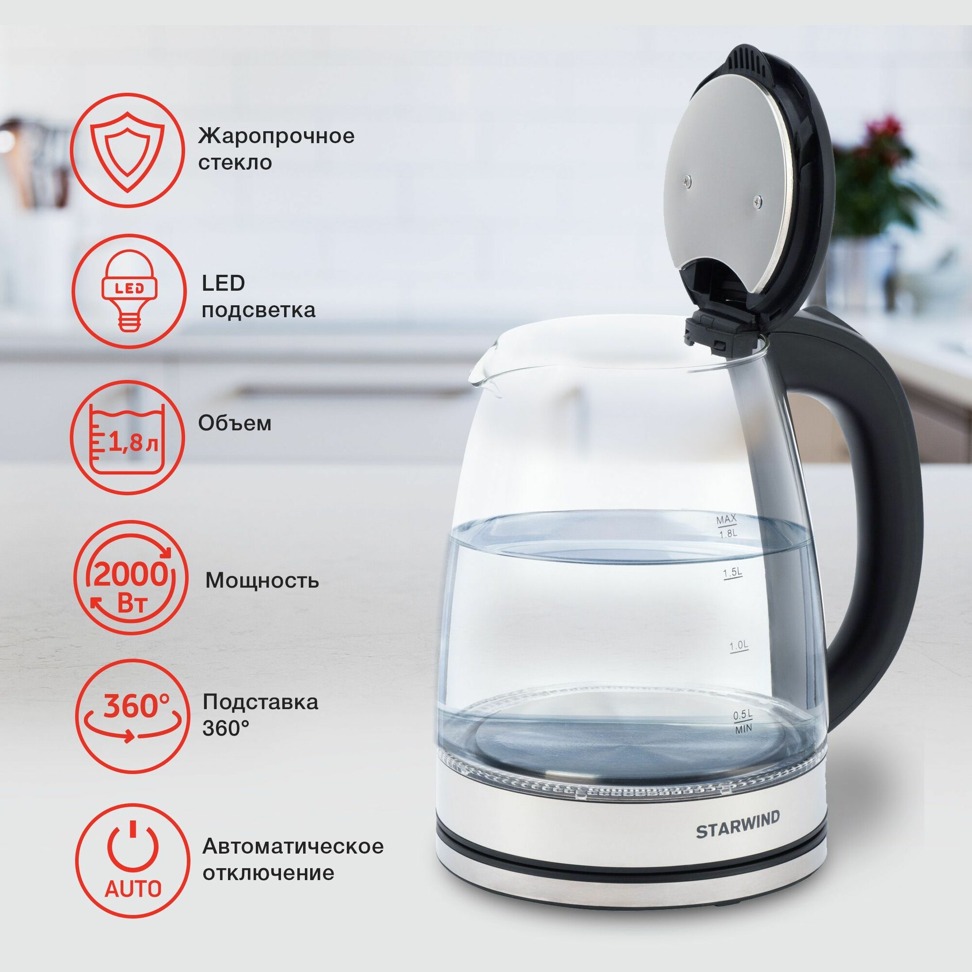 Чайник электрический Starwind SKG4777 черный/прозрачный, стекло