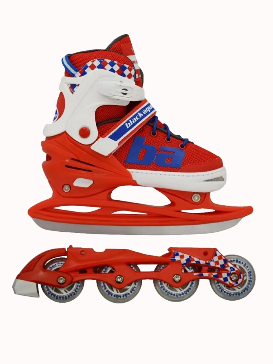 Коньки + ролики/ Коньки детские ледовые раздвижные с роликовой платформой BlackAqua AS-409 красно-синие размер 27-30