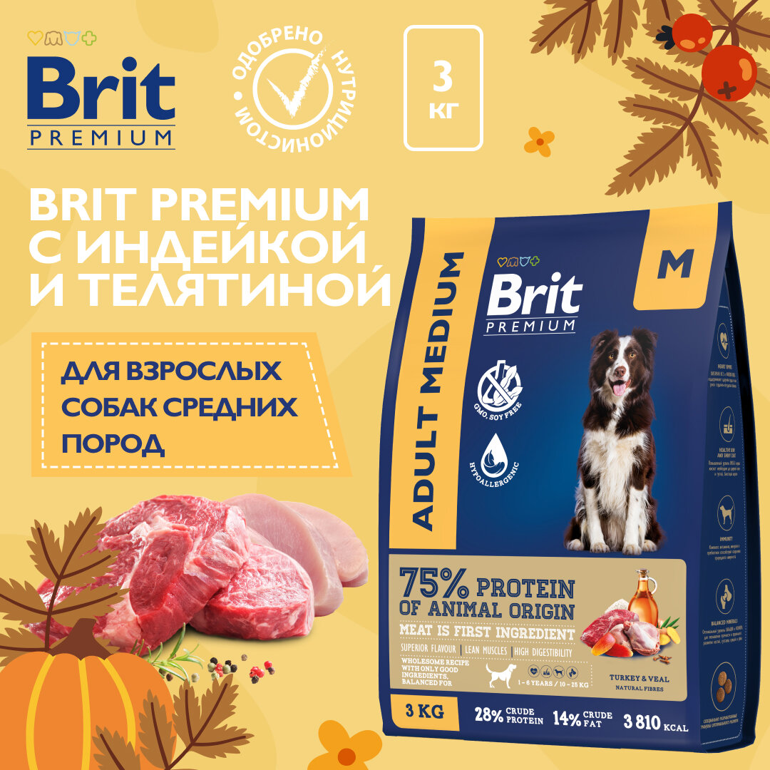 Корм для собак Корм сухой Brit Premium Dog Adult Medium для взрослых собак средних пород 10–25 кг, с индейкой и телятиной 3 кг