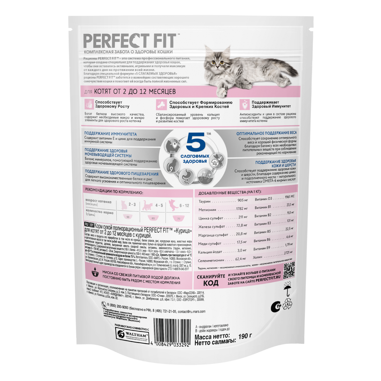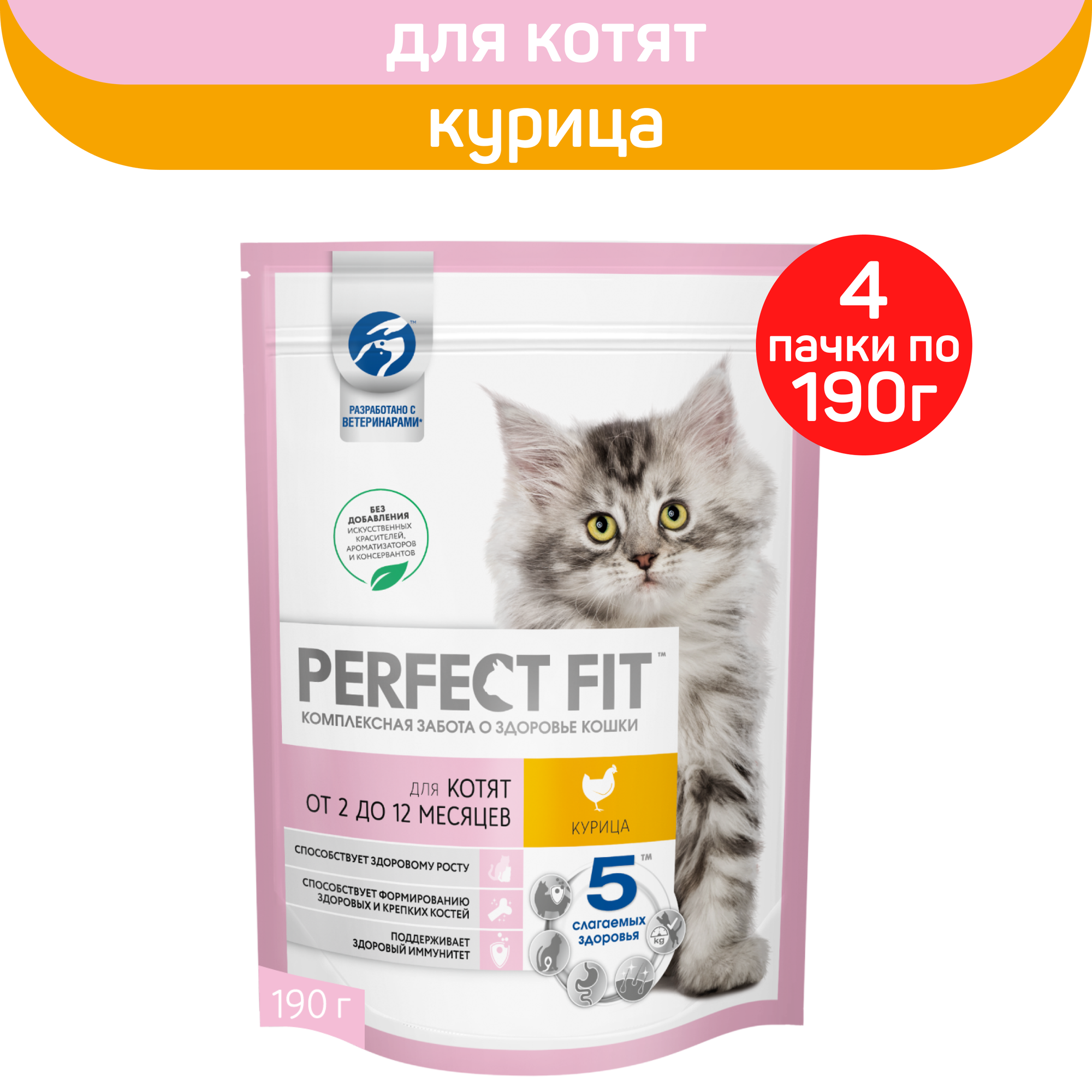 Корм для кошек Cухой полнорационный корм PERFECT FIT для котят от 2 до 12 месяцев, с курицей, 4 шт по 190 г