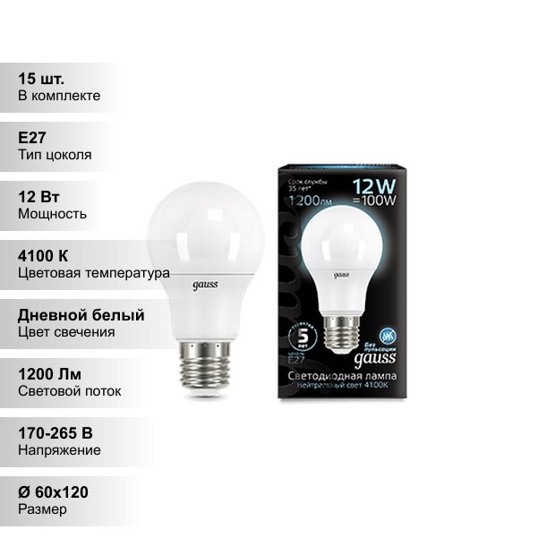 Лампочки (15 шт.) Светодиодная лампочка Gauss Globe А60 12Вт 150-265Вт 4100K E27