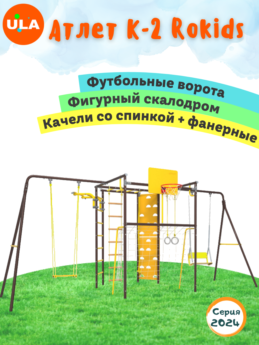 Игровая спортивная площадка «УДСК-7.3 Атлет-К2» Rokids, цвет: Шоколад, ступени: противоскользящие, качели: со спинкой и фанерные