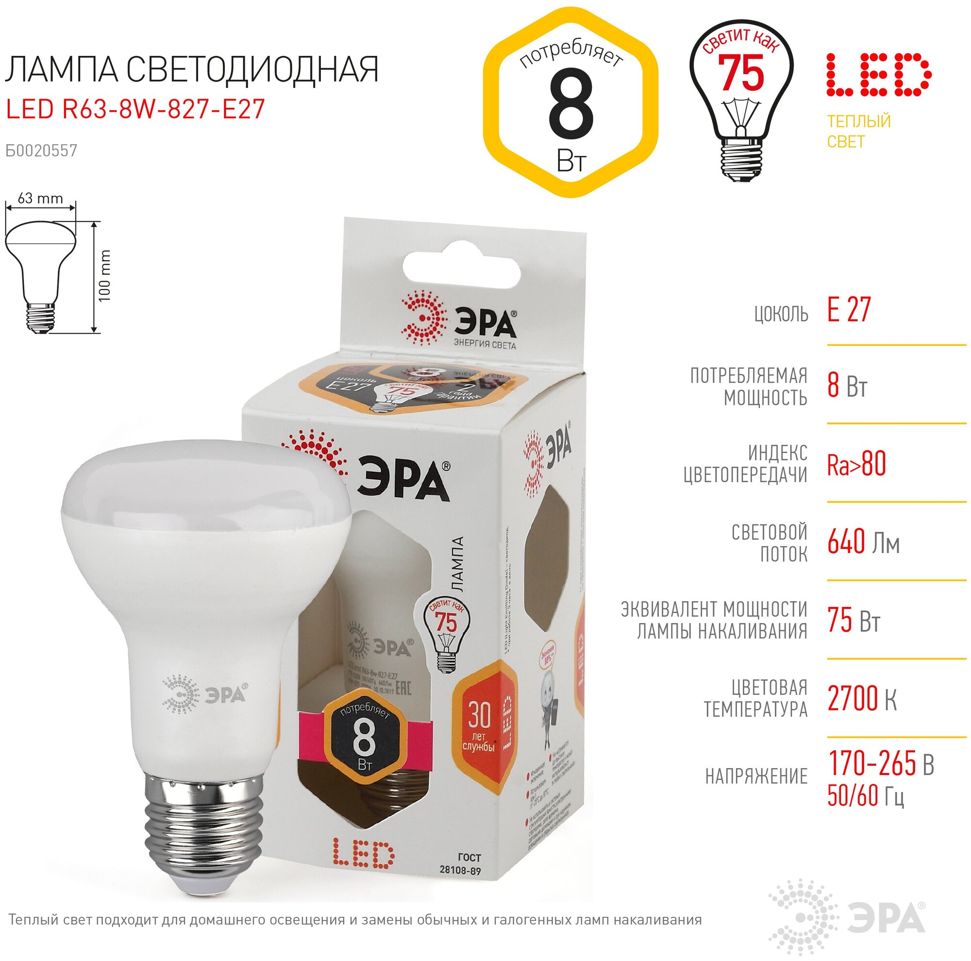 Лампа светодиодная ЭРА Б0020557, E27, R63, 8 Вт, 2700 К