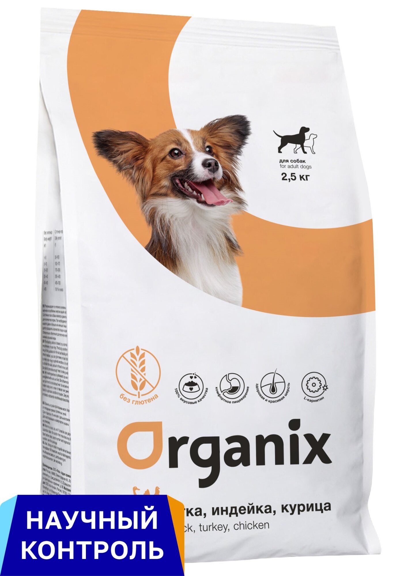 Корм для собак Organix полнорационный беззерновой сухой корм для активных взрослых собак 3 вида мяса: утка, индейка и курица, 2,5 кг