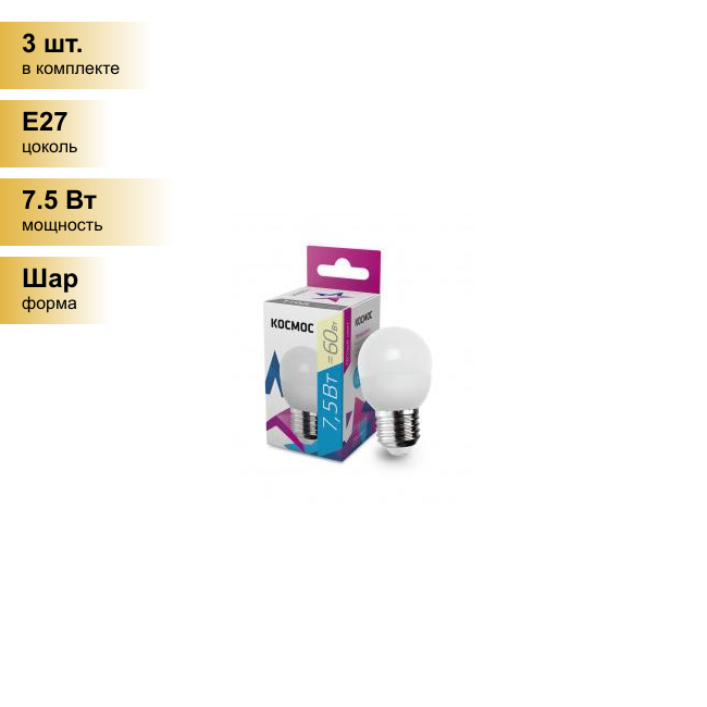 Лампочки (3 шт.) Светодиодная лампочка Космос шар E27 7,5W (7W) (590lm) 3000K 2K матов. 82x45 LkecLED7.5wGL45E2730 . Цоколь E27