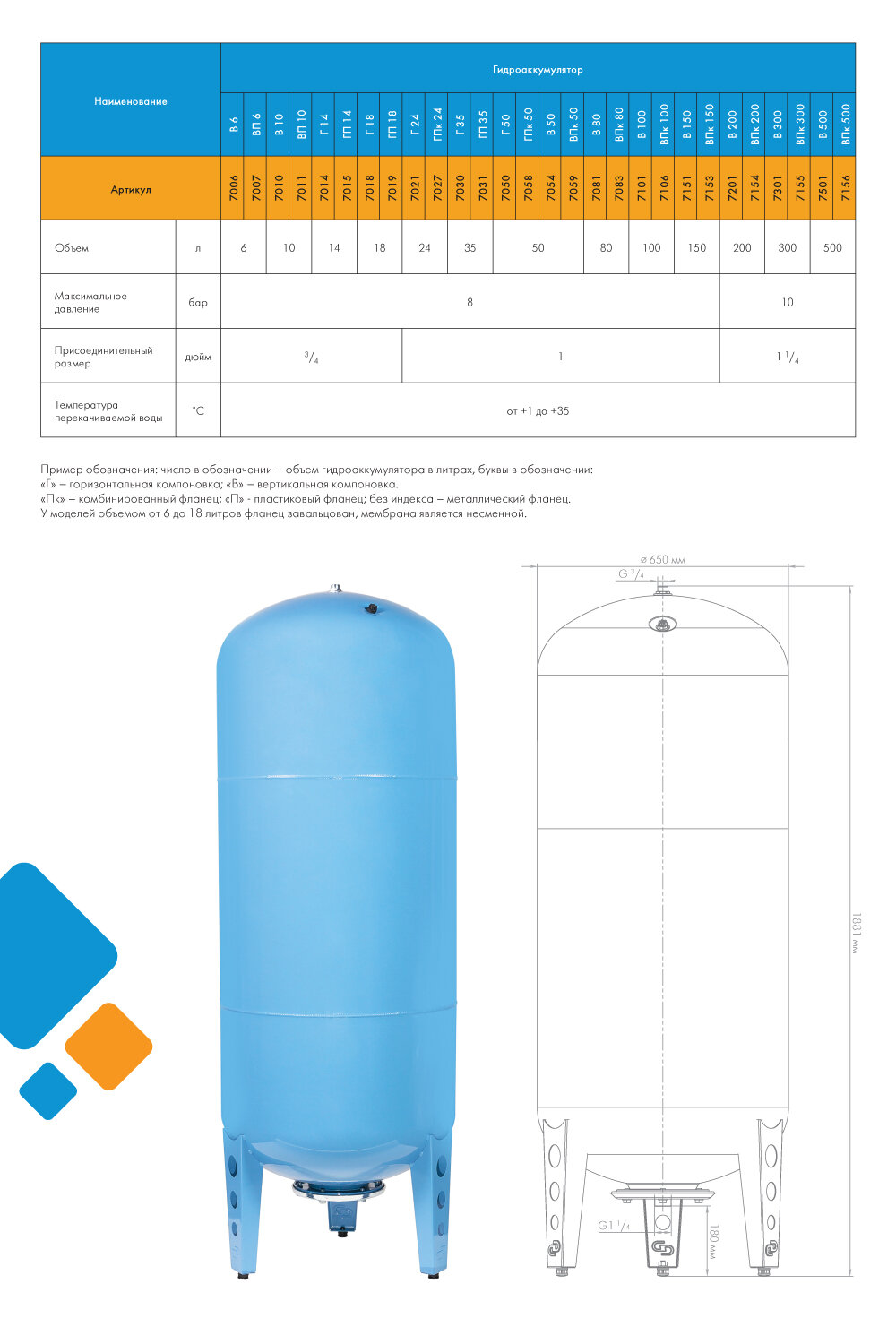 Гидроаккумулятор верт син 500л 10атм 1 1/4" НР В Джилекс, ДЖИЛЕКС 7501 (1 шт.)