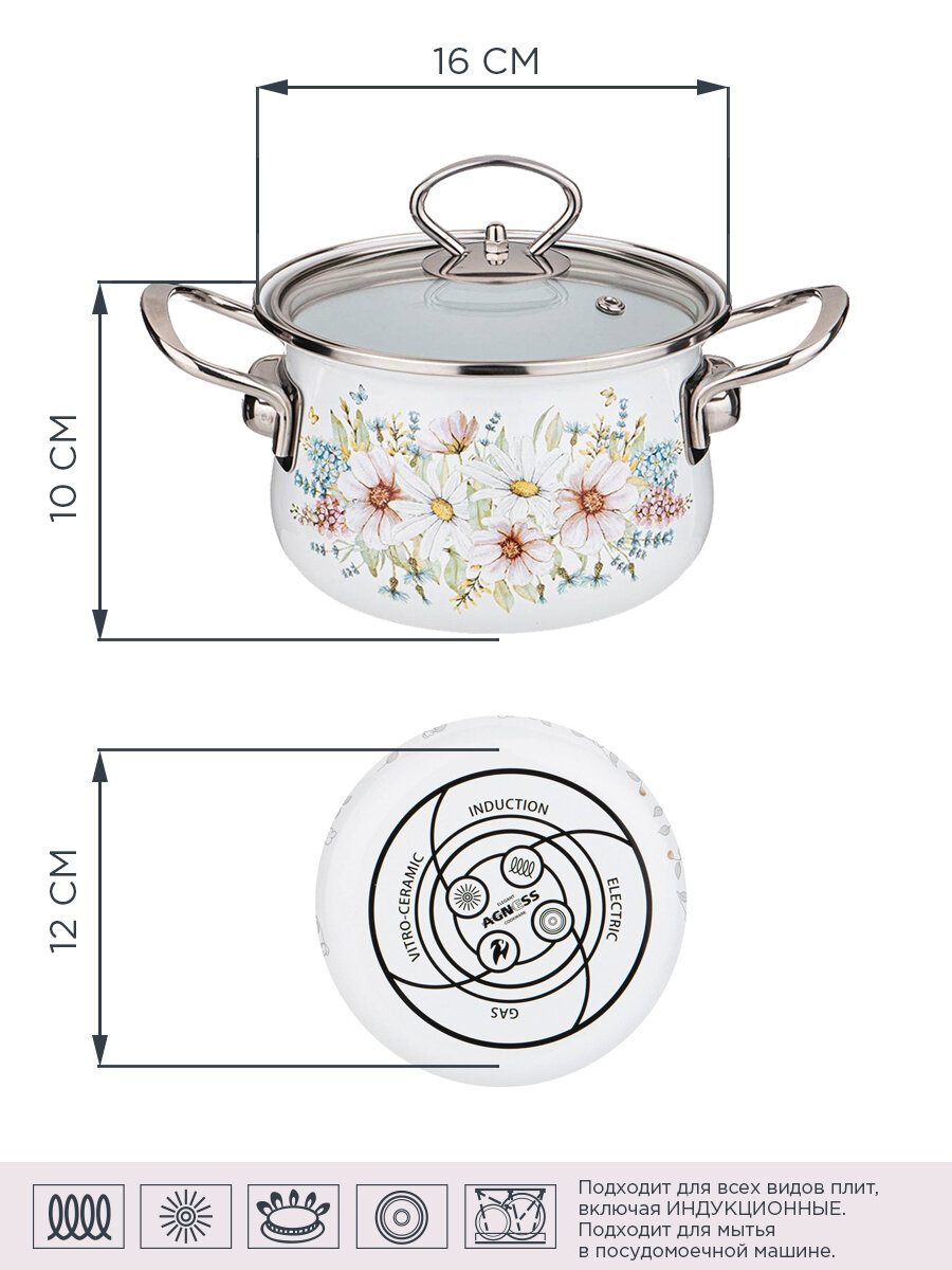 Кастрюли Кастрюля Agness эмалированная со стеклянной крышкой серия "дворцовый парк" 1.5 л, 16*10 см