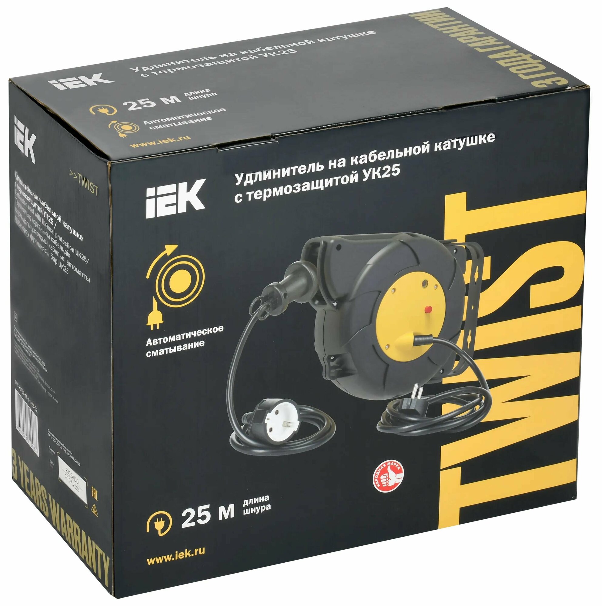 Сетевые фильтры и удлинители Удлинитель на катушке TWIST 1х25м с заземл. автосмотка 16А IP20 ПВС 3х1.5 IEK TW-KP27-16-01-25-02
