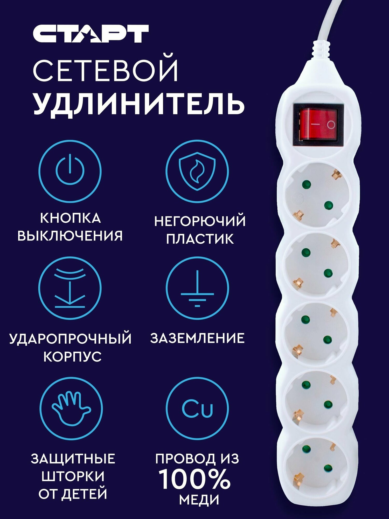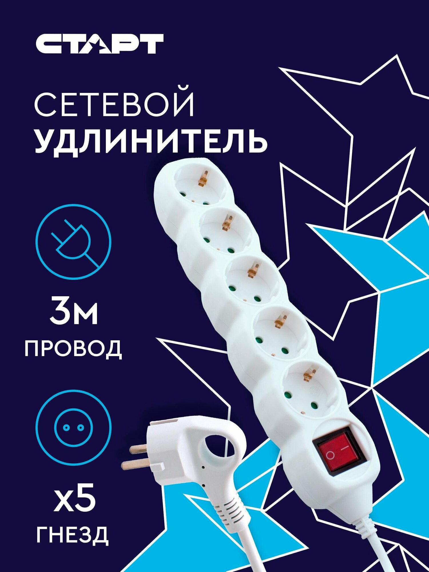 Сетевой фильтр / удлинитель Удлинитель сетевой бытовой с заземлением 3м старт 5 розеток с выключателем и защитой от детей, 10А, ПВС 3х0.75, 2200 Вт