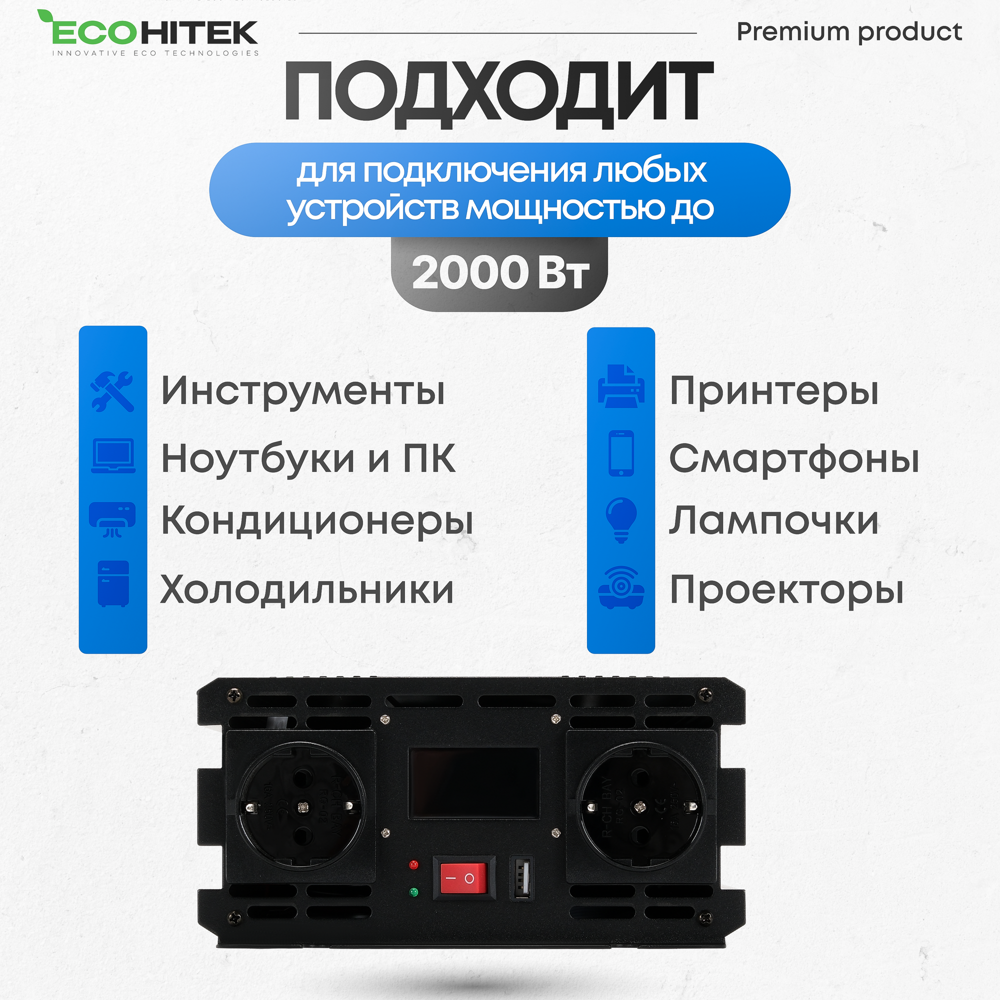 Автомобильные инверторы Инвертор автомобильный 12 220В, 4000 Вт (пост нагрузка до 2000 Вт) EcoHitek. Чистый синус. Подключение приборов, эл. инструмента.