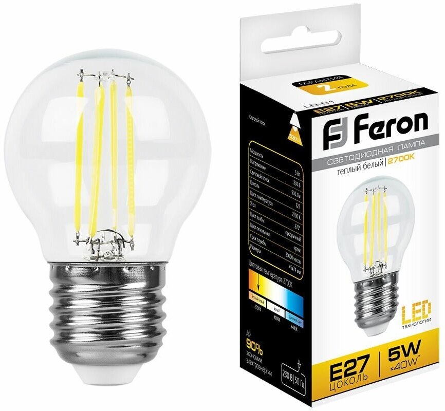 Лампа светодиодная филамент FERON LB-61 арт. 25581, G45 (шар малый) 5W E27 2700К (теплый) 230V
