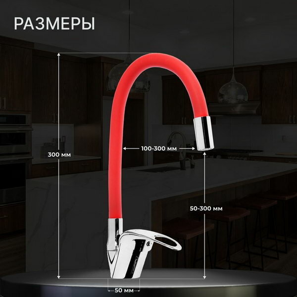 Смеситель для кухни ZEIN Z2113, однорычажный, гибкий излив, картридж 40 мм, красный/хром (1шт.)
