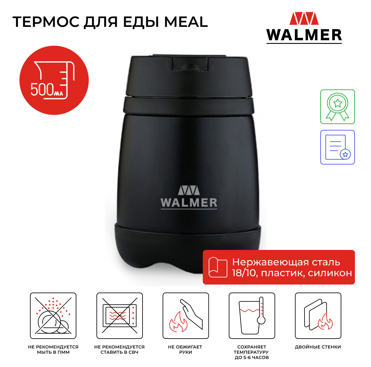 Термос термос WALMER Meal с широким горлом, ложкой 500мл сталь, пластик, силикон