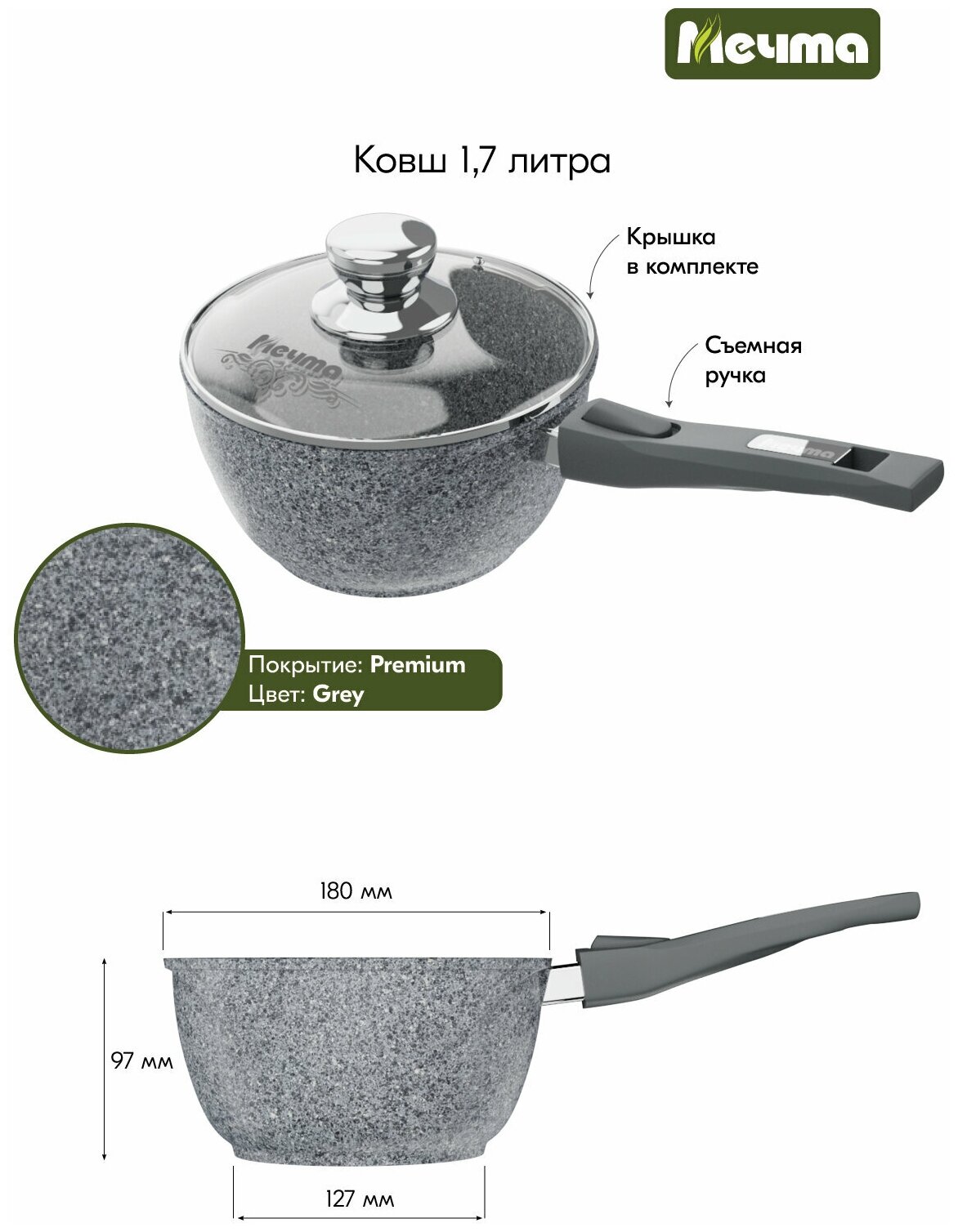 Кастрюля Ковш "Мечта" 1.7л Премиум с антипригарным покрытием со съемной ручкой и крышкой, можно мыть в посудомоечной машине