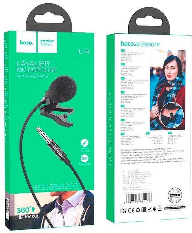 Микрофоны Петличный микрофон Hoco L14, разъем 3.5 мм, 2 м, чёрный