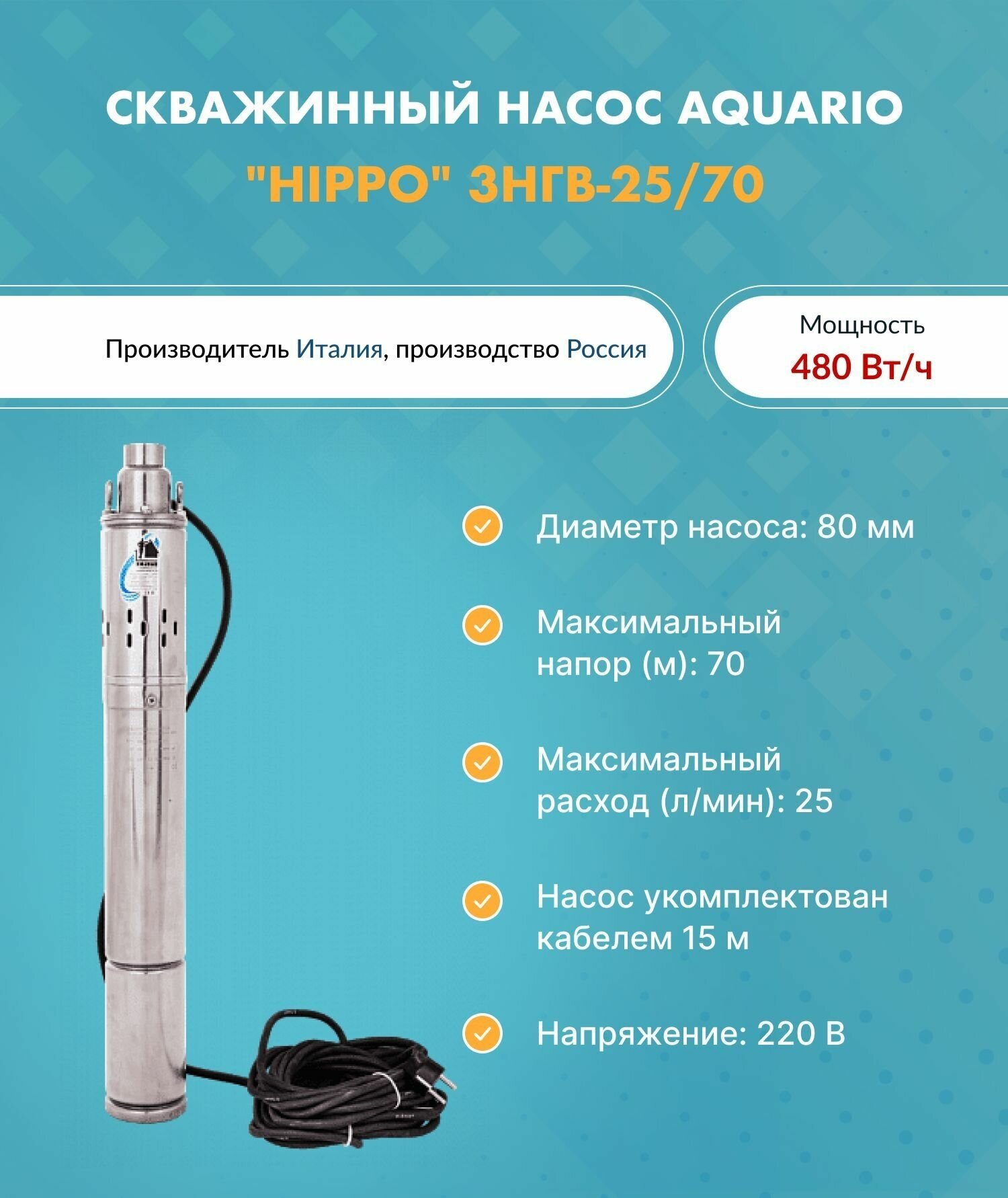 Скважинные насосы Насос скважинный "HIPPO" 3НГВ-25/70 (кабель 15м) AQUARIO 3457 (Акварио) (H-70 м, Q-25 л/мин)
