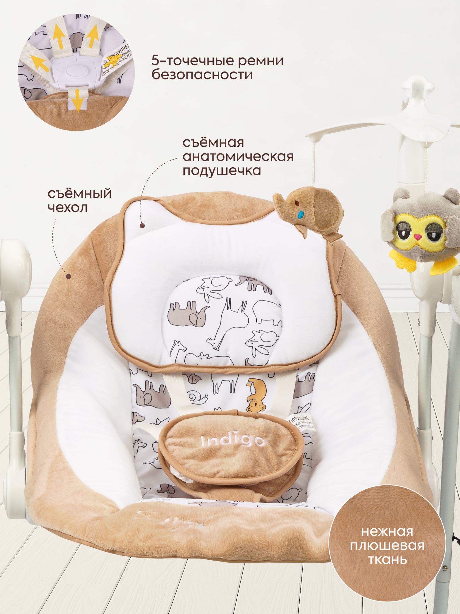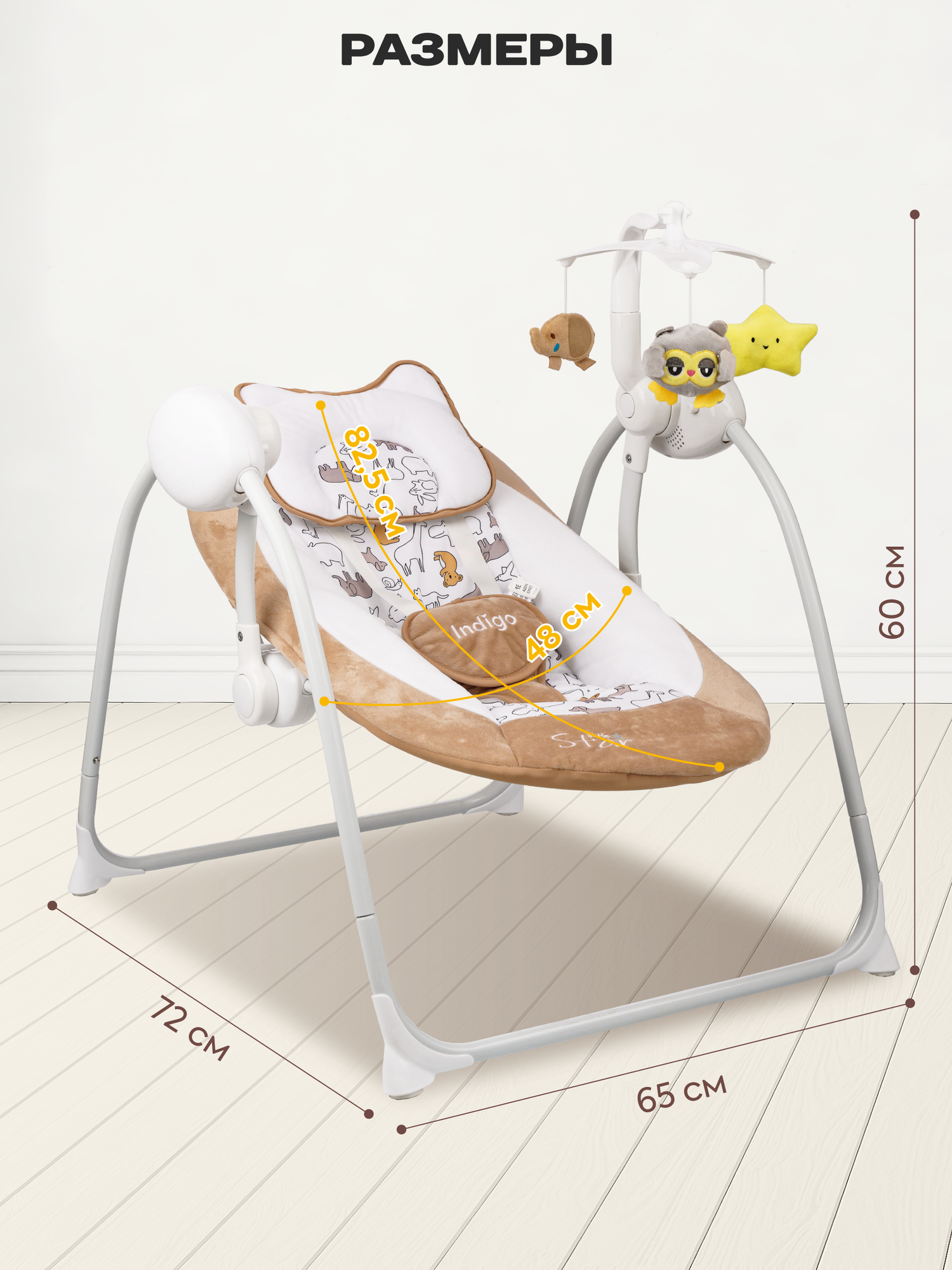 Электрокачели Indigo STAR с мобилем и пультом, коричневый 8 909 ₽ Подробнее