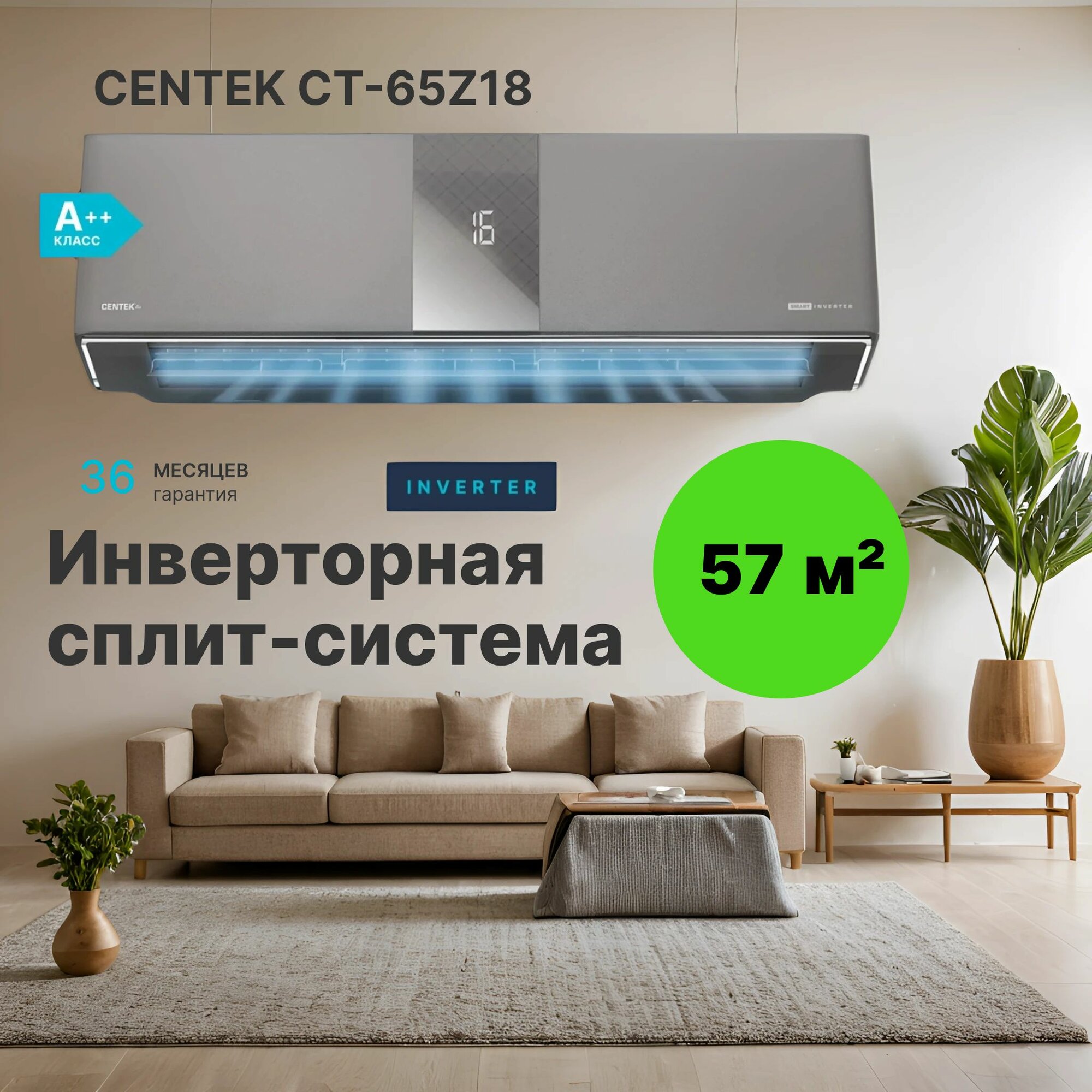 Кондиционер Кондиционер сплит система инверторный Centek CT-65Z18, бесшумный, для помещения до 57 кв.м.