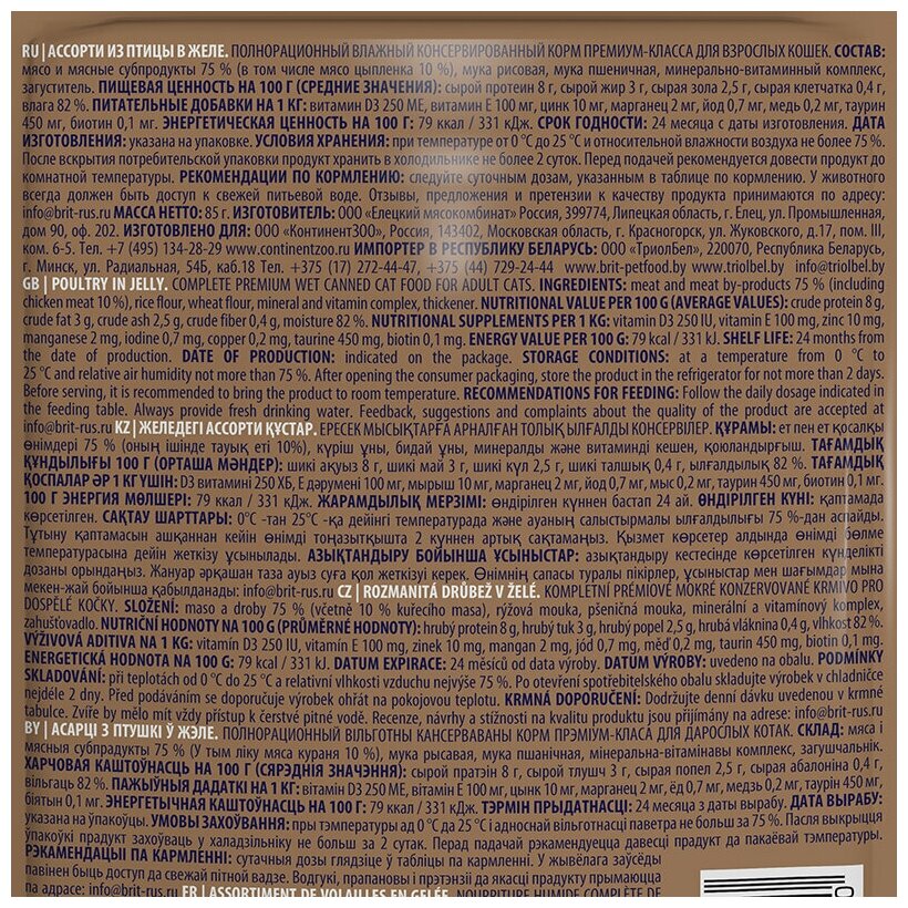 Корм для кошек BRIT PREMIUM для взрослых кошек c ассорти из птицы в желе пауч 85 гр 85 гр х 4 шт